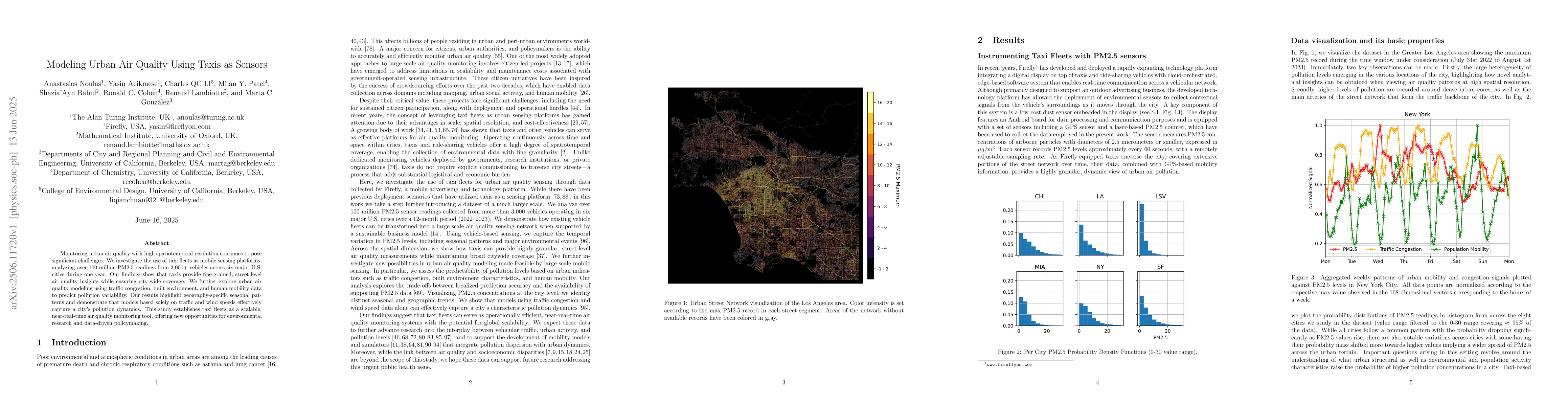 Monitoring urban air quality with high spatiotemporal resolution continues to pose significant challenges. We investigate the use of taxi fleets as mobile sensing platforms, analyzing over 100 million PM2.5 readings from more than 3,000 vehicles across six major U.S. cities during one year. Our findings show that taxis provide fine-grained, street-level air quality insights while ensuring city-wide coverage. We further explore urban air quality modeling using traffic congestion, built environment, and human mobility data to predict pollution variability. Our results highlight geography-specific seasonal patterns and demonstrate that models based solely on traffic and wind speeds effectively capture a city's pollution dynamics. This study establishes taxi fleets as a scalable, near-real-time air quality monitoring tool, offering new opportunities for environmental research and data-driven policymaking.