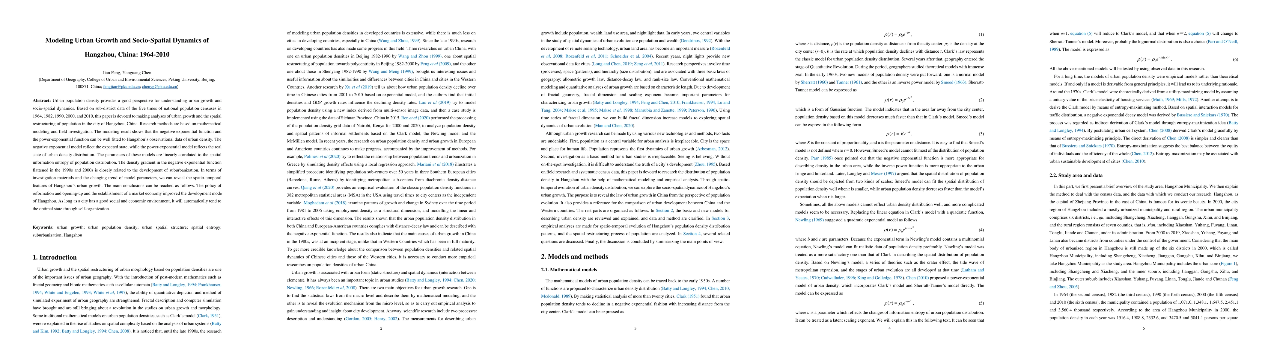 This paper models urban growth and socio-spatial dynamics in Hangzhou from 1964 to 2010 using mathematical modeling and census data. The study finds that negative and power-exponential functions effectively describe urban density, with suburbanization flattening density gradients since the 1990s.