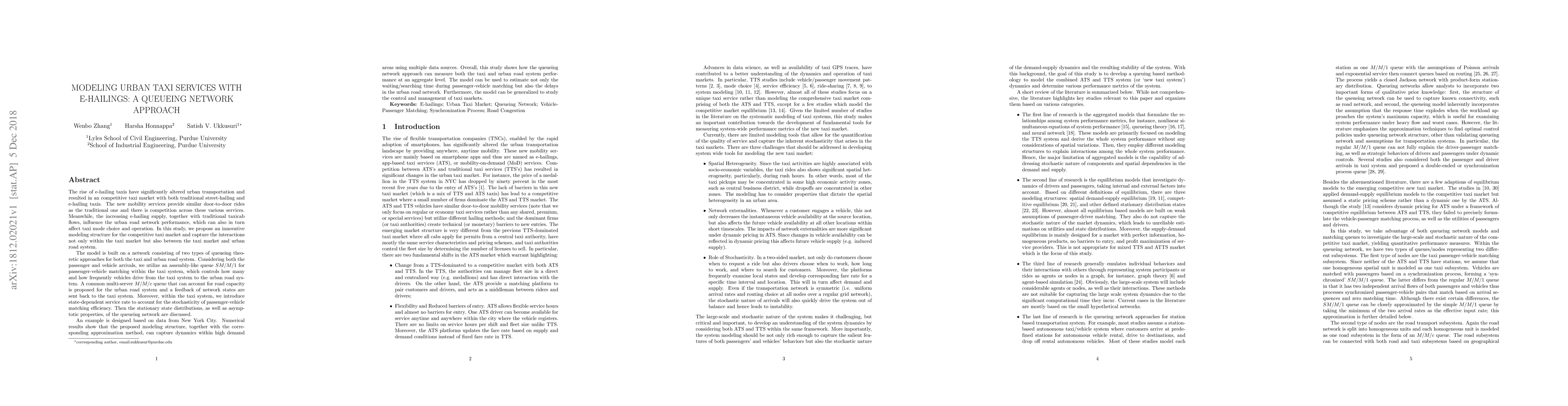 The rise of e-hailing taxis has significantly altered urban transportation and resulted in a competitive taxi market with both traditional street-hailing and e-hailing taxis. The new mobility services provide similar door-to-door rides as the traditional one and there is competition across these various services. In this study, we propose an innovative queueing network model for the competitive taxi market and capture the interactions not only within the taxi market but also between the taxi market and urban road system. An example is designed based on data from New York City. Numerical results show that the proposed modeling structure, together with the corresponding stationary limits, can capture dynamics within high demand areas using multiple data sources. Overall, this study shows how the queueing network approach can measure both the taxi and urban road system performance at an aggregate level. The model can be used to estimate not only the waiting/searching time during passenger-vehicle matching but also the delays in the urban road network. Furthermore, the model can be generalized to study the control and management of taxi markets.