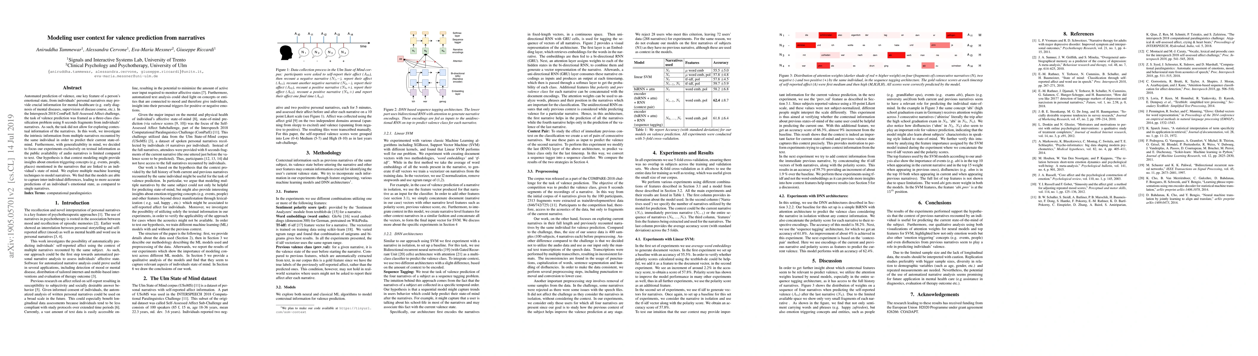 Automated prediction of valence, one key feature of a person's emotional state, from individuals' personal narratives may provide crucial information for mental healthcare (e.g. early diagnosis of mental diseases, supervision of disease course, etc.). In the Interspeech 2018 ComParE Self-Assessed Affect challenge, the task of valence prediction was framed as a three-class classification problem using 8 seconds fragments from individuals' narratives. As such, the task did not allow for exploring contextual information of the narratives. In this work, we investigate the intrinsic information from multiple narratives recounted by the same individual in order to predict their current state-of-mind. Furthermore, with generalizability in mind, we decided to focus our experiments exclusively on textual information as the public availability of audio narratives is limited compared to text. Our hypothesis is, that context modeling might provide insights about emotion triggering concepts (e.g. events, people, places) mentioned in the narratives that are linked to an individual's state of mind. We explore multiple machine learning techniques to model narratives. We find that the models are able to capture inter-individual differences, leading to more accurate predictions of an individual's emotional state, as compared to single narratives.
