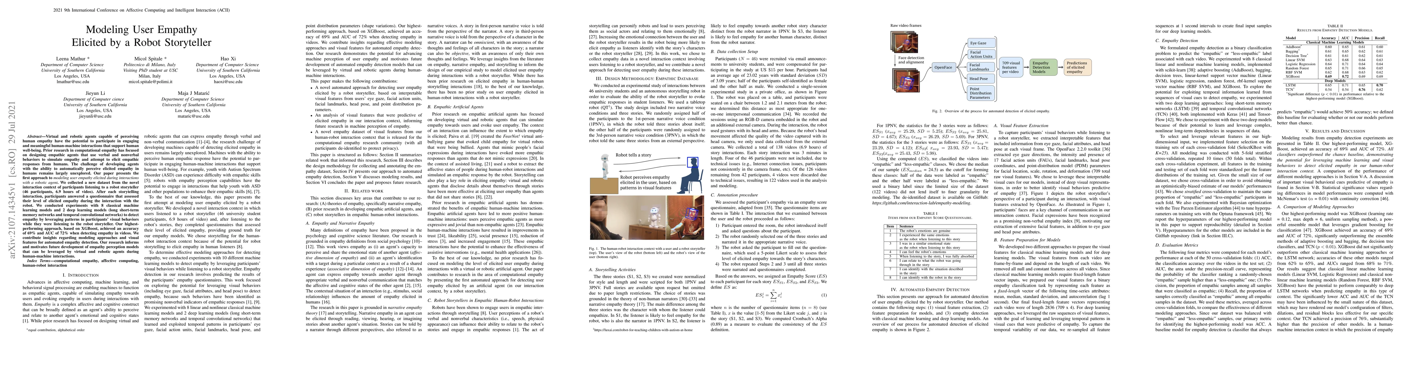 This paper introduces a novel approach to modeling user empathy elicited by a robot storyteller, using a dataset from participants' visual behaviors during storytelling interactions. The study achieved 69% accuracy with XGBoost in detecting empathy, contributing valuable insights for future empathy perception models in human-machine interactions.