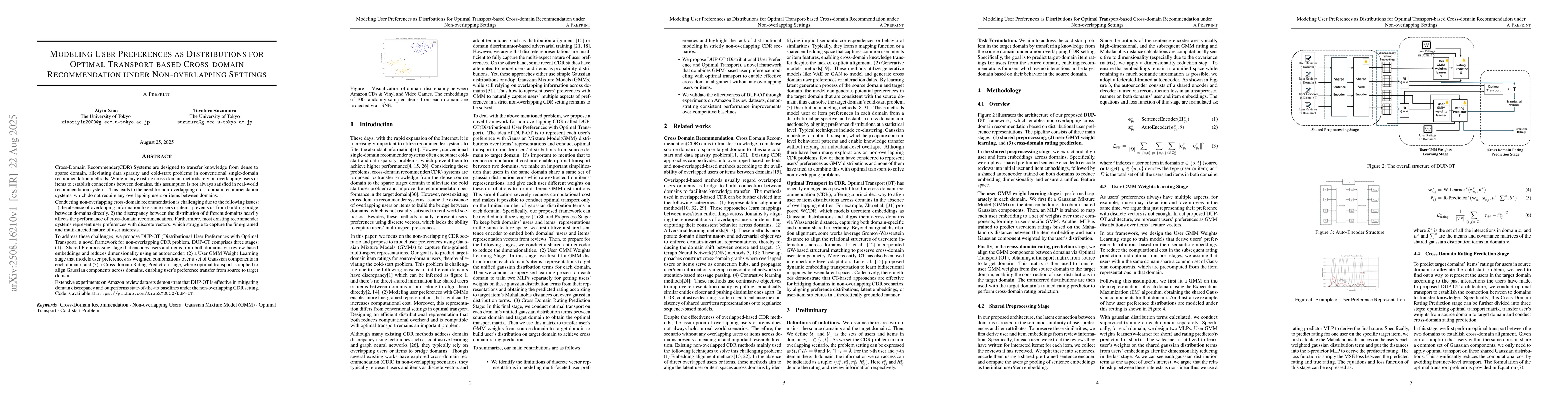 Cross-Domain Recommender (CDR) systems aim to transfer knowledge from dense to sparse domains, alleviating data sparsity and cold-start issues in single-domain recommendation. While many methods assume overlapping users or items to connect domains, this is often unrealistic in real-world settings. Thus, non-overlapping CDR systems, which require no shared users or items, are needed. However, non-overlapping CDR is challenging due to: (1) the absence of overlap preventing direct bridges between domains, and (2) large distributional discrepancies degrading transfer performance. Moreover, most recommenders represent user preferences as discrete vectors, failing to capture their fine-grained, multi-faceted nature. We propose DUP-OT (Distributional User Preferences with Optimal Transport), a framework for non-overlapping CDR. DUP-OT has three stages: (1) Shared Preprocessing, where review-based embeddings and an autoencoder encode users and items from both domains; (2) User GMM Weight Learning, which models user preferences as Gaussian mixtures with learned weights; and (3) Cross-domain Rating Prediction, where optimal transport aligns Gaussian components across domains, enabling preference transfer from source to target. Experiments on Amazon review datasets show that DUP-OT effectively mitigates domain discrepancy and outperforms state-of-the-art baselines under the non-overlapping CDR setting.