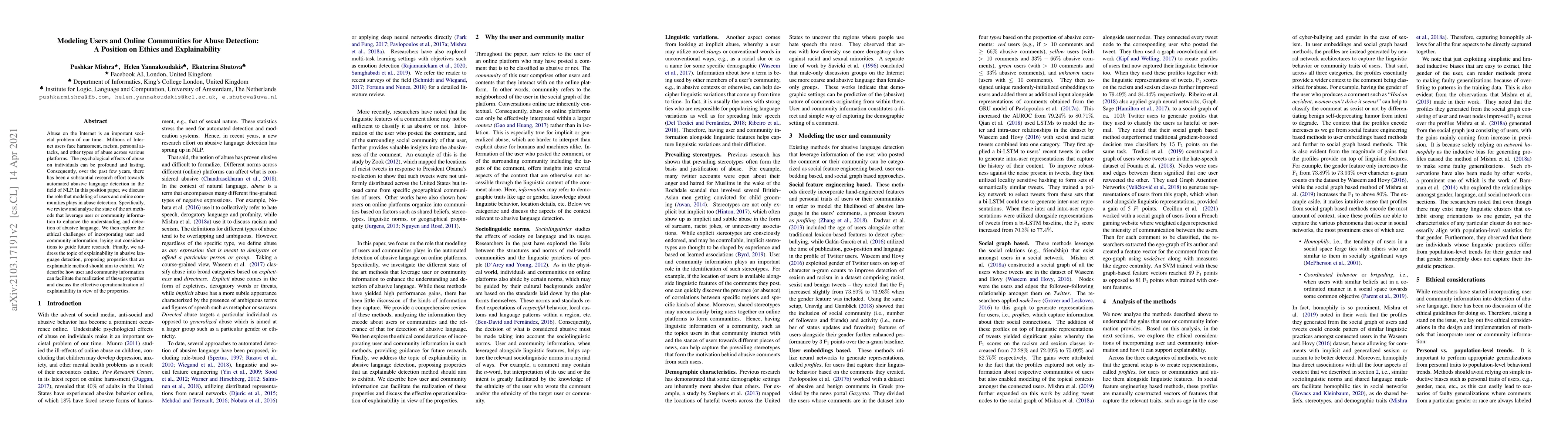 Abuse on the Internet is an important societal problem of our time. Millions of Internet users face harassment, racism, personal attacks, and other types of abuse across various platforms. The psychological effects of abuse on individuals can be profound and lasting. Consequently, over the past few years, there has been a substantial research effort towards automated abusive language detection in the field of NLP. In this position paper, we discuss the role that modeling of users and online communities plays in abuse detection. Specifically, we review and analyze the state of the art methods that leverage user or community information to enhance the understanding and detection of abusive language. We then explore the ethical challenges of incorporating user and community information, laying out considerations to guide future research. Finally, we address the topic of explainability in abusive language detection, proposing properties that an explainable method should aim to exhibit. We describe how user and community information can facilitate the realization of these properties and discuss the effective operationalization of explainability in view of the properties.