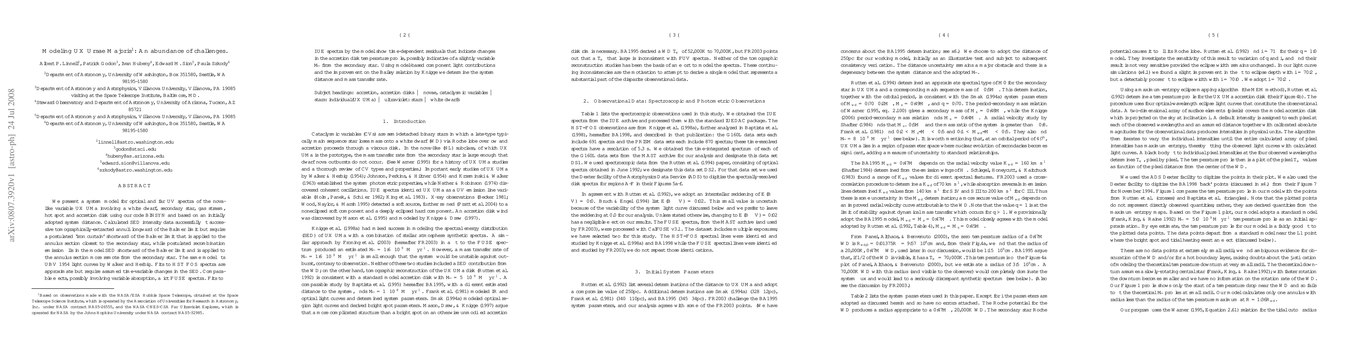 This paper models the optical and far UV spectra of the nova-like variable UX UMa, incorporating a white dwarf, secondary star, gas stream, hot spot, and accretion disk. The model fits long-wavelength data well but requires additional assumptions for short-wavelength spectra, including a postulated "iron curtain" and recombination emission.