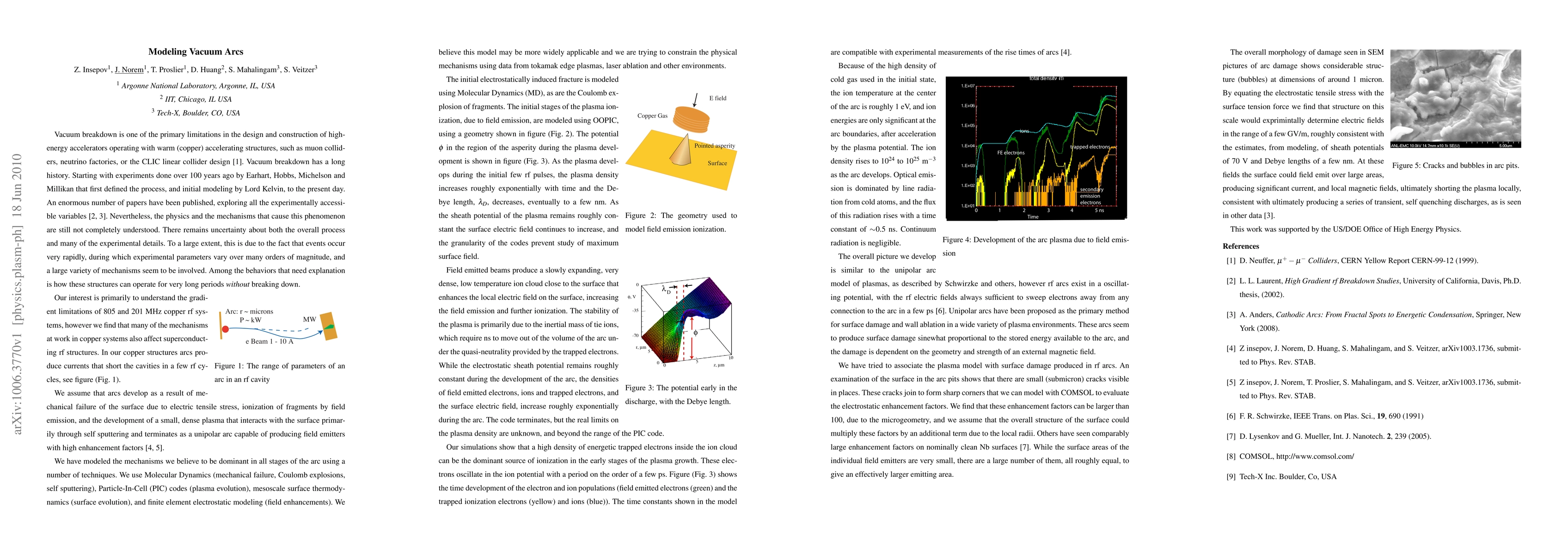 This paper develops a comprehensive model for vacuum arcs, explaining their initiation through surface mechanical failure and Coulomb explosions, followed by plasma evolution and surface damage via self sputtering. The model employs Molecular Dynamics, Particle-In-Cell codes, and finite element electrostatic modeling to simulate the mechanisms and compare them with existing theories.