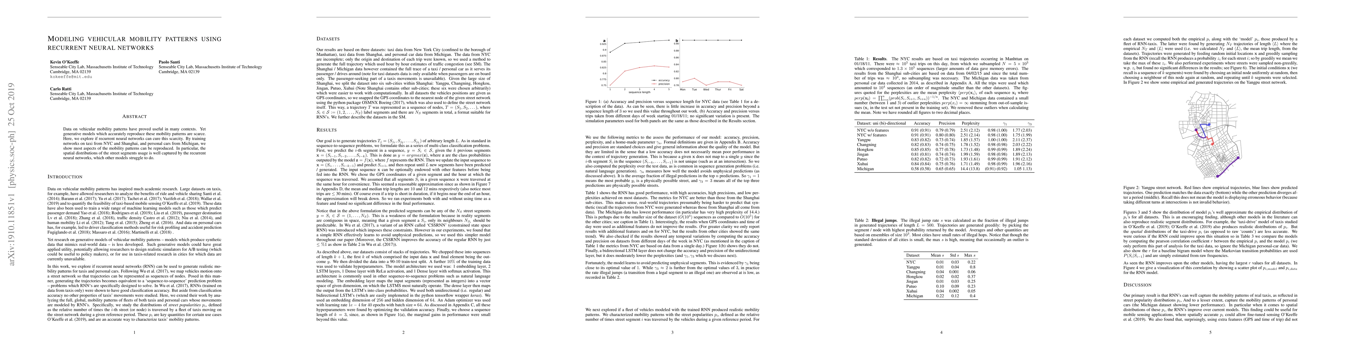 This paper investigates the use of recurrent neural networks to model vehicular mobility patterns, demonstrating their effectiveness in capturing the spatial distribution of street segment usage through training on data from NYC, Shanghai, and Michigan. The results show that these networks outperform other models in reproducing complex mobility patterns.