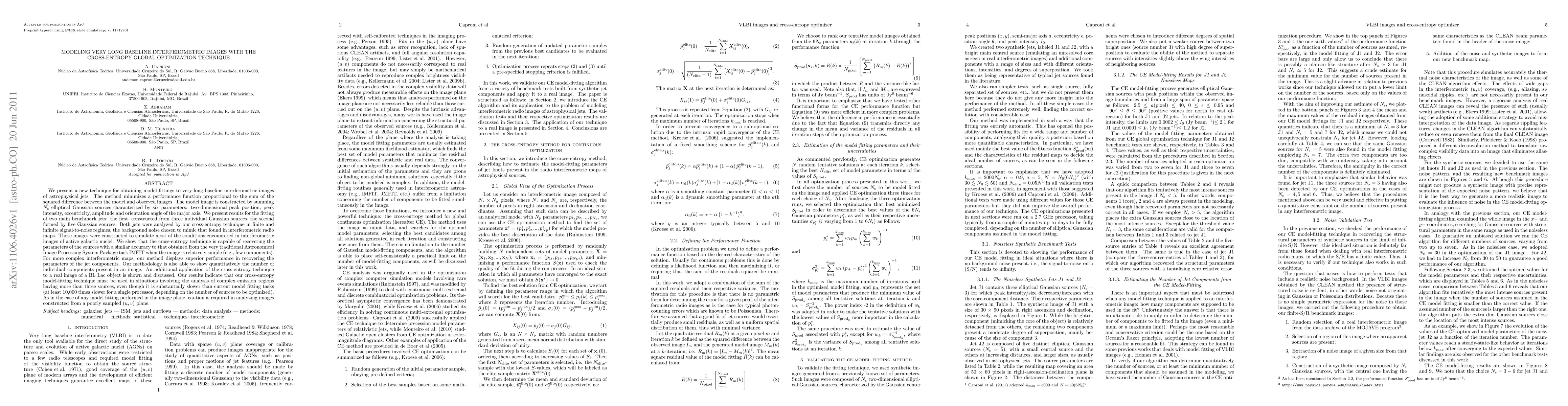 We present a new technique for obtaining model fittings to VLBI images of astrophysical jets. The method minimizes a performance function proportional to the sum of the squared difference between the model and observed images. The model image is constructed by summing elliptical Gaussian sources characterized by six parameters: two-dimensional peak position, peak intensity, eccentricity, amplitude and orientation angle of the major axis. We present results for the fitting of two main benchmark jets: the first, constructed from three individual Gaussian sources, the second formed by five Gaussian sources. Both jets were analyzed by our cross-entropy technique in finite and infinite signal-to-noise regimes, the background noise chosen to mimic that found in interferometric radio maps. We show that our technique is capable of recovering the parameters of the sources with a similar accuracy to that obtained from the traditional AIPS task IMFIT when the image is relatively simple (e.g., few components). For more complex maps, our method displays superior performance in recovering the parameters of the jet components. Our methodology is also able to show quantitatively the number of individual components present in an image. An additional application of the cross-entropy technique to a real image of a BL Lac object is shown and discussed. Our results indicate that our cross-entropy technique must be used in situations involving the analysis of complex emission regions having more than three sources, even though it is substantially slower than current model fitting tasks (at least 10,000 times slower for a single processor, depending on the number of sources to be optimized). As in the case of any model fitting performed in the image plane, caution is required in analyzing images constructed from a poorly sampled (u,v) plane.