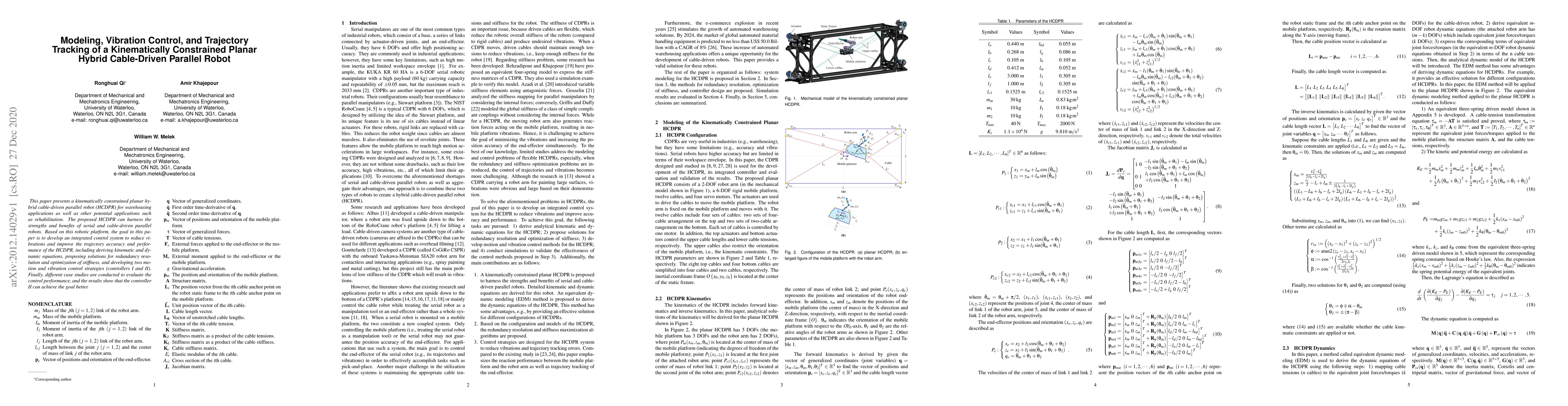 This paper develops a kinematically constrained planar hybrid cable-driven parallel robot (HCDPR) for applications like warehousing and rehabilitation, and proposes integrated control strategies to reduce vibrations and enhance trajectory accuracy, with controller II showing superior performance in evaluations.