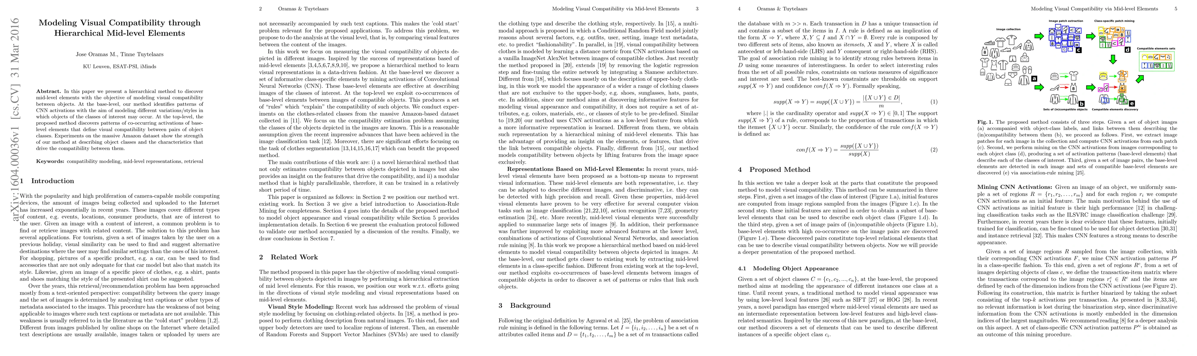 This paper introduces a hierarchical method to identify mid-level elements, modeling visual compatibility between object classes by analyzing CNN activations and co-occurring patterns, demonstrating effectiveness on the Amazon dataset.