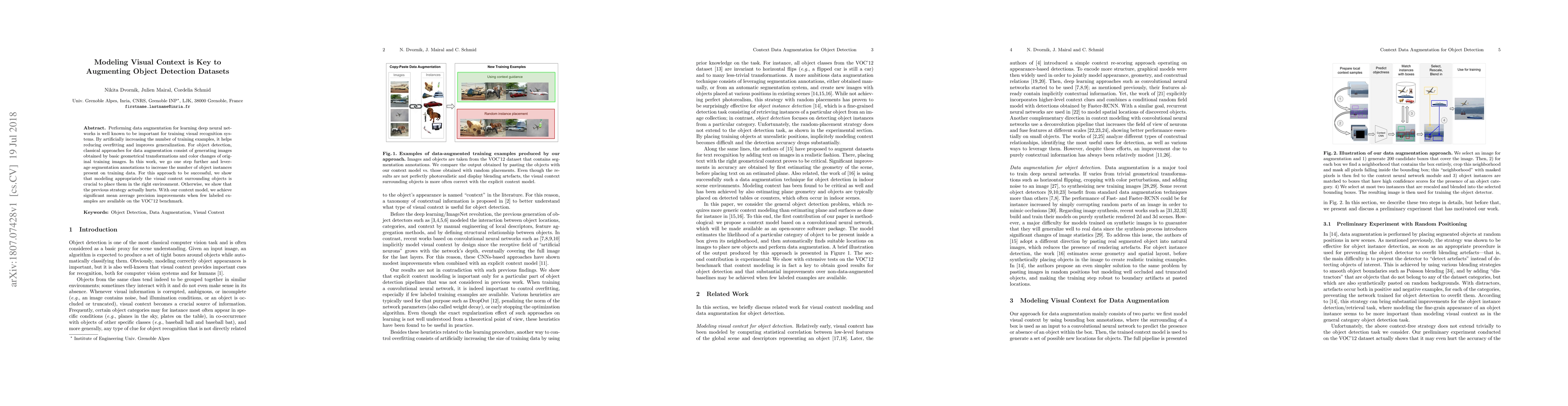 Performing data augmentation for learning deep neural networks is well known to be important for training visual recognition systems. By artificially increasing the number of training examples, it helps reducing overfitting and improves generalization. For object detection, classical approaches for data augmentation consist of generating images obtained by basic geometrical transformations and color changes of original training images. In this work, we go one step further and leverage segmentation annotations to increase the number of object instances present on training data. For this approach to be successful, we show that modeling appropriately the visual context surrounding objects is crucial to place them in the right environment. Otherwise, we show that the previous strategy actually hurts. With our context model, we achieve significant mean average precision improvements when few labeled examples are available on the VOC'12 benchmark.
