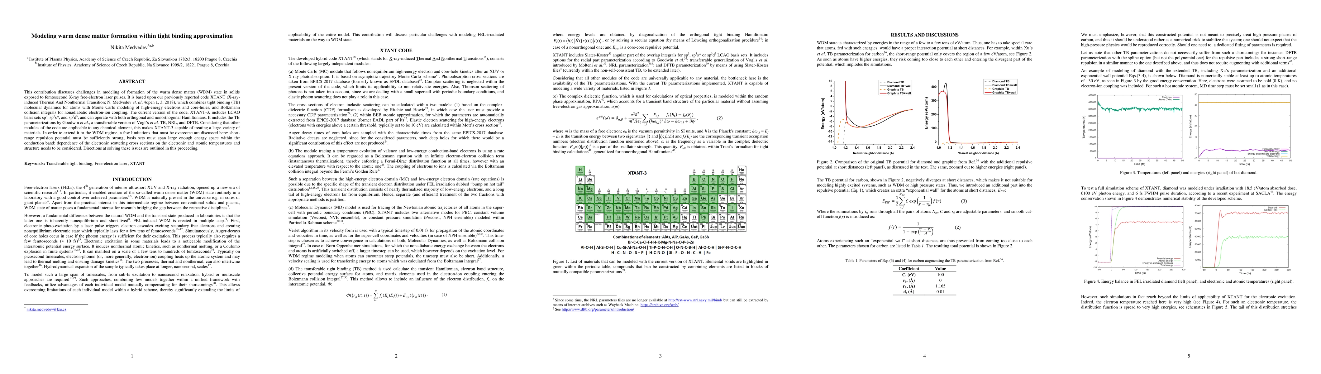 This contribution discusses challenges in the modeling of formation of the warm dense matter (WDM) state in solids exposed to femtosecond X-ray free-electron laser pulses. It is based upon our previously reported code XTANT (X-ray-induced Thermal And Nonthermal Transition; N. Medvedev et. al, 4open 1, 3, 2018), which combines tight-binding (TB) molecular dynamics for atoms with Monte Carlo modeling of high-energy electrons and core-holes, and Boltzmann collision integrals for nonadiabatic electron-ion coupling. The current version of the code, XTANT-3, includes LCAO basis sets sp3, sp3s*, and sp3d5, and can operate with both orthogonal and nonorthogonal Hamiltonians. It includes the TB parameterizations by Goodwin et al., a transferrable version of Vogl's et al. TB, NRL, and DFTB. Considering that other modules of the code are applicable to any chemical element, this makes XTANT-3 capable of treating a large variety of materials. In order to extend it to the WDM regime, a few limitations that must be overcome are discussed here: short-range repulsion potential must be sufficiently strong; basis sets must span large enough energy space within the conduction band; dependence of the electronic scattering cross sections on the electronic and atomic temperatures and structure needs to be considered. Directions at solving these issues are outlined in this proceeding.