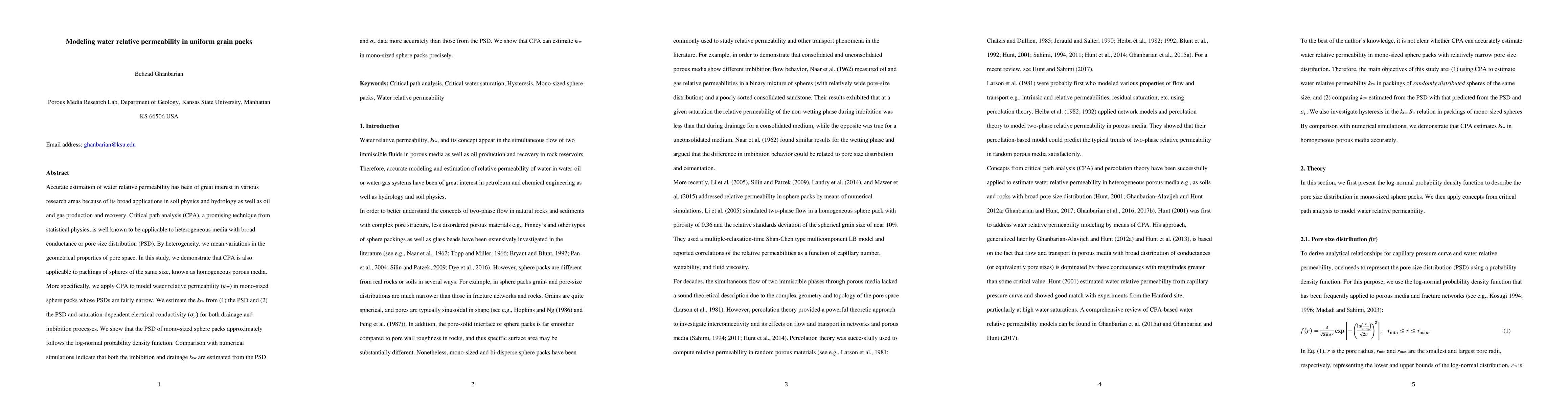 This study applies critical path analysis (CPA) to model water relative permeability in mono-sized sphere packs, demonstrating its accuracy in estimating krw from pore size distribution (PSD) and saturation-dependent electrical conductivity. CPA provides more precise krw estimates compared to PSD alone.