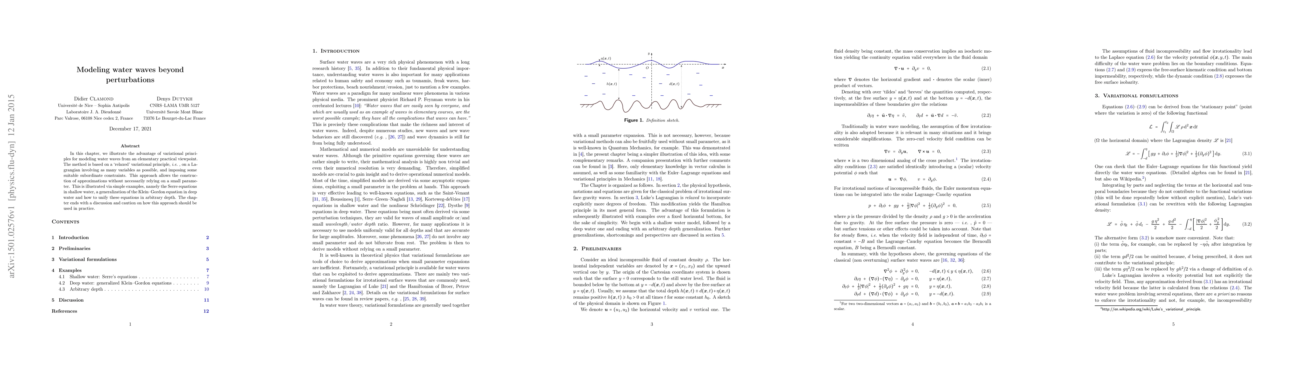 This paper explores variational principles for modeling water waves without relying on small perturbation parameters, using a relaxed variational approach with multiple variables. It demonstrates this method through examples like the Serre equations and Klein-Gordon equation unification, and cautions on practical application.