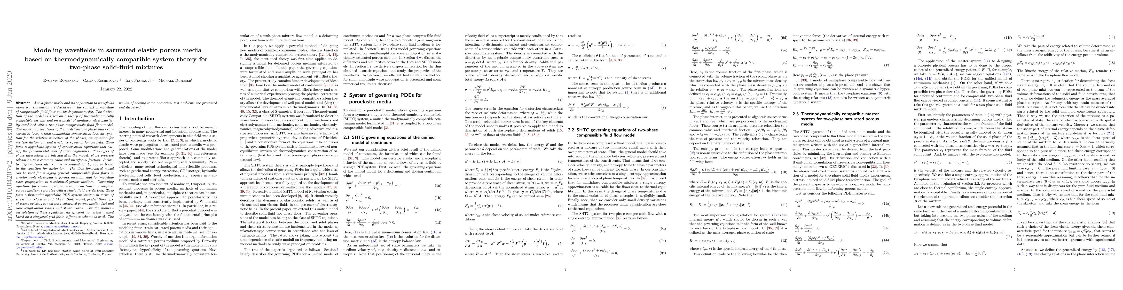 This paper develops a thermodynamically compatible two-phase model for simulating wavefields in saturated elastic porous media, incorporating phase pressure relaxation, interfacial friction, and elastoplastic deformations. The model predicts three types of waves and uses a staggered-grid finite difference scheme for numerical solutions.