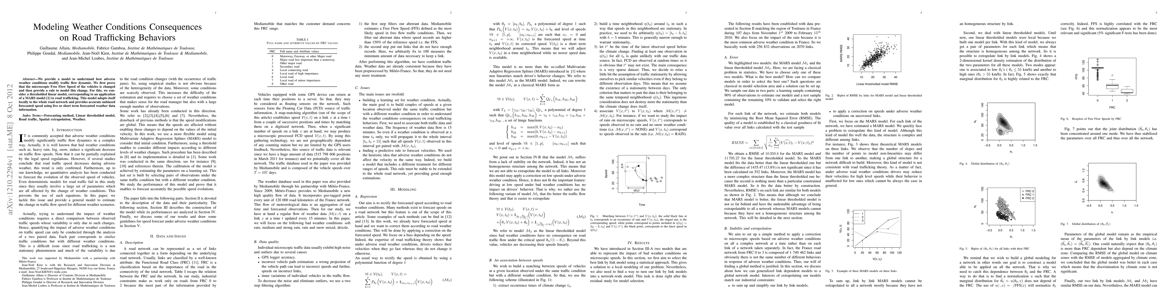 We provide a model to understand how adverse weather conditions modify traffic flow dynamic. We first prove that the microscopic Free Flow Speed of the vehicles is changed and then provide a rule to model this change. For this, we consider a thresholded linear model, corresponding to an application of a MARS model to road trafficking. This model adapts itself locally to the whole road network and provides accurate unbiased forecasted speed using live or short term forecasted weather data information.