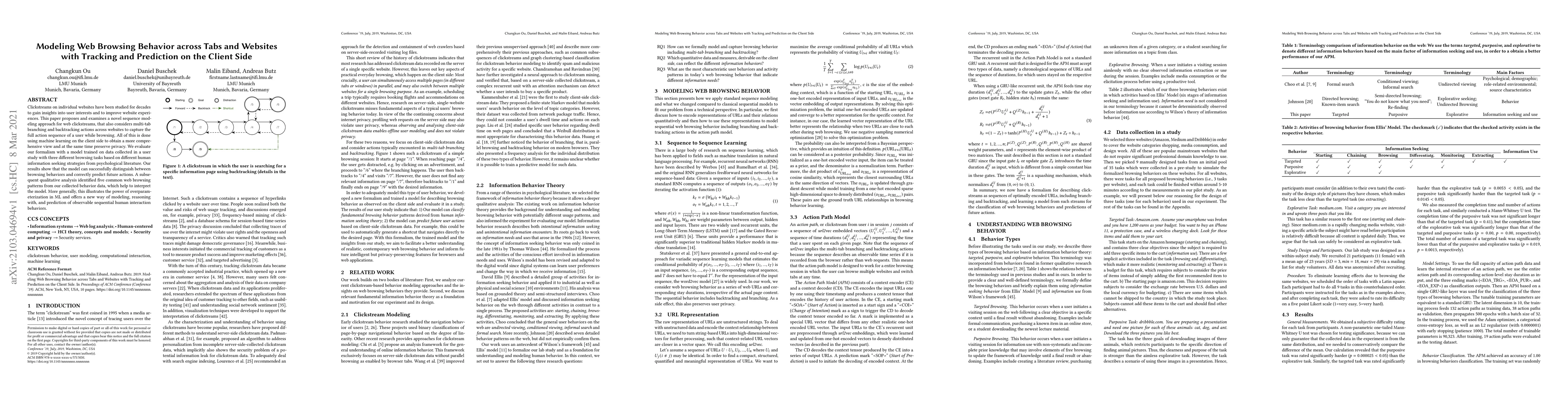 Clickstreams on individual websites have been studied for decades to gain insights into user interests and to improve website experiences. This paper proposes and examines a novel sequence modeling approach for web clickstreams, that also considers multi-tab branching and backtracking actions across websites to capture the full action sequence of a user while browsing. All of this is done using machine learning on the client side to obtain a more comprehensive view and at the same time preserve privacy. We evaluate our formalism with a model trained on data collected in a user study with three different browsing tasks based on different human information seeking strategies from psychological literature. Our results show that the model can successfully distinguish between browsing behaviors and correctly predict future actions. A subsequent qualitative analysis identified five common web browsing patterns from our collected behavior data, which help to interpret the model. More generally, this illustrates the power of overparameterization in ML and offers a new way of modeling, reasoning with, and prediction of observable sequential human interaction behaviors.