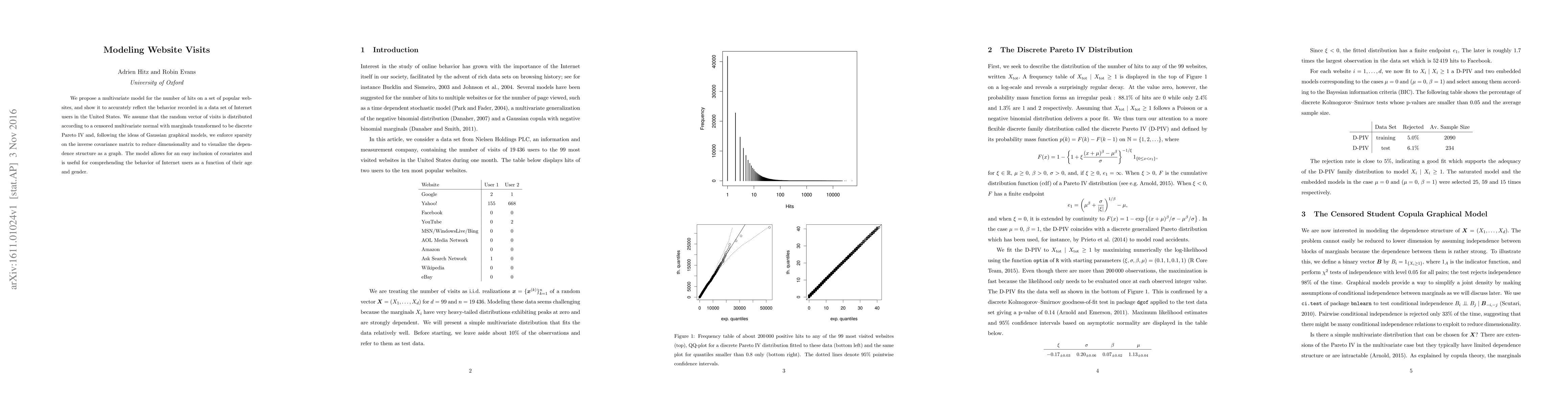 This research proposes a multivariate model to predict website visits based on Internet users' age and gender, using a censored normal distribution with discrete Pareto IV marginals. The model allows for easy inclusion of covariates and provides insights into user behavior.