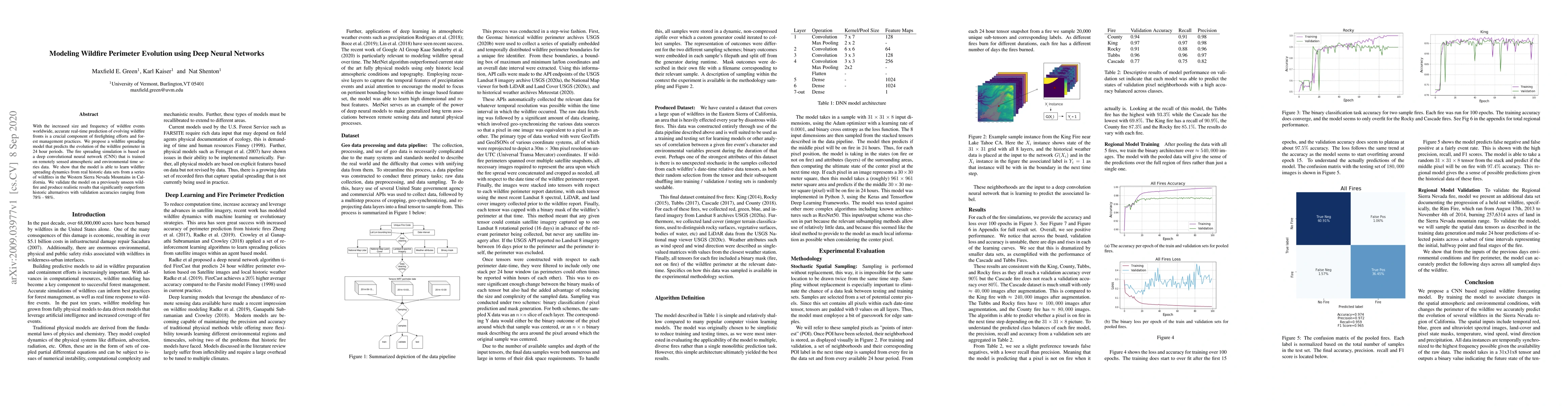 This paper proposes a deep convolutional neural network model to predict the evolution of wildfire perimeters over 24-hour periods using remotely sensed atmospheric and environmental data. The model is trained on historic wildfire data from California and demonstrates high validation accuracy, outperforming traditional methods.