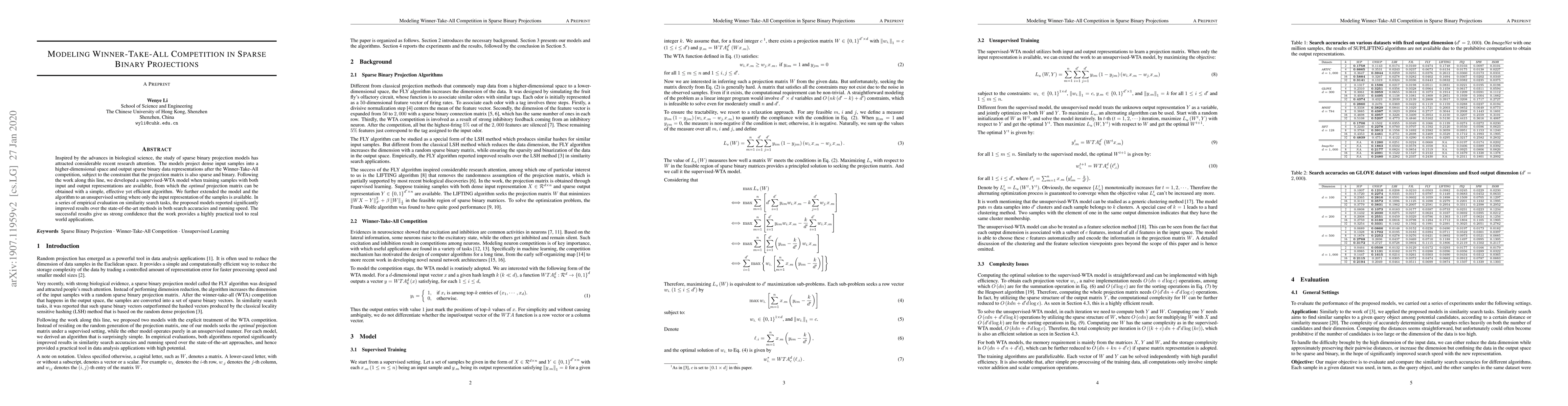 This paper develops supervised and unsupervised sparse binary projection models for Winner-Take-All competitions, achieving superior search accuracy and speed over state-of-the-art methods, demonstrating their practical utility in real-world applications.