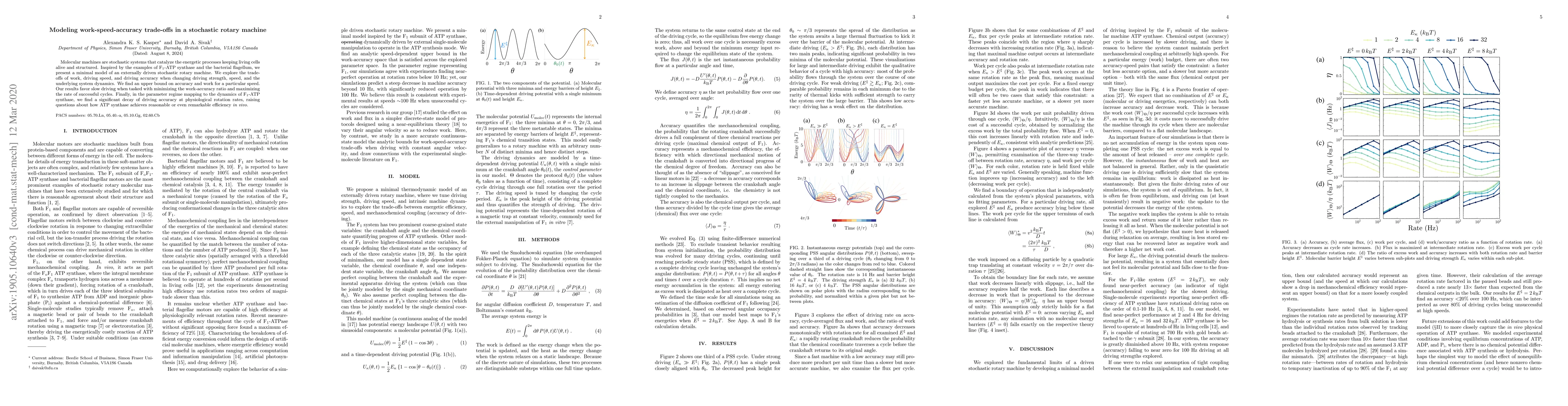 This paper models a stochastic rotary machine, like F1-ATP synthase, to explore the trade-offs between work, speed, and accuracy. It finds that slow driving optimizes work-accuracy ratio and cycle success rate, while highlighting a loss of accuracy at physiological speeds for F1-ATP synthase.