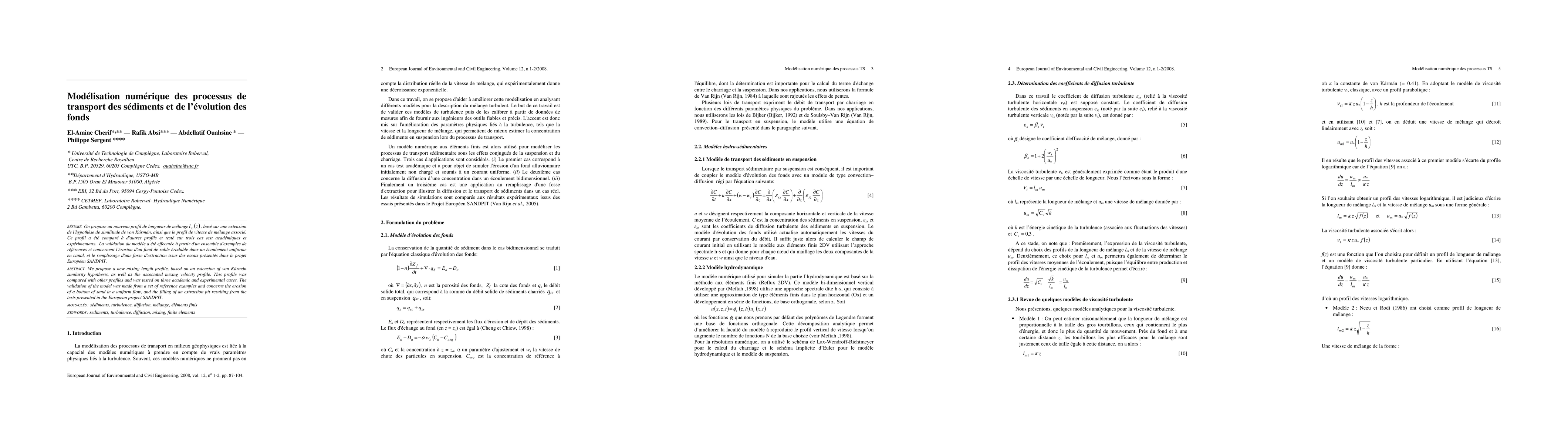 We propose a new mixing length profile, based on an extension of von K\'arm\'an similarity hypothesis, as well as the associated mixing velocity profile. This profile was compared with other profiles and was tested on three academic and experimental cases. The validation of the model was made from a set of reference examples and concerns the erosion of a bottom of sand in a uniform flow, and the filling of an extraction pit resulting from the tests presented in the European project SANDPIT. -- On propose un nouveau profil de longueur de m\'elange lm (z), bas\'e sur une extension de l'hypoth\`ese de similitude de von K\'arm\'an, ainsi que le profil de vitesse de m\'elange associ\'e. Ce profil a \'et\'e compar\'e \`a d'autres profils et test\'e sur trois cas test acad\'emiques et exp\'erimentaux. La validation du mod\`ele a \'et\'e effectu\'ee \`a partir d'un ensemble d'exemples de r\'ef\'erences et concernent l'\'erosion d'un fond de sable \'erodable dans un \'ecoulement uniforme en canal, et le remplissage d'une fosse d'extraction issus des essais pr\'esent\'es dans le projet Europ\'een SANDPIT.