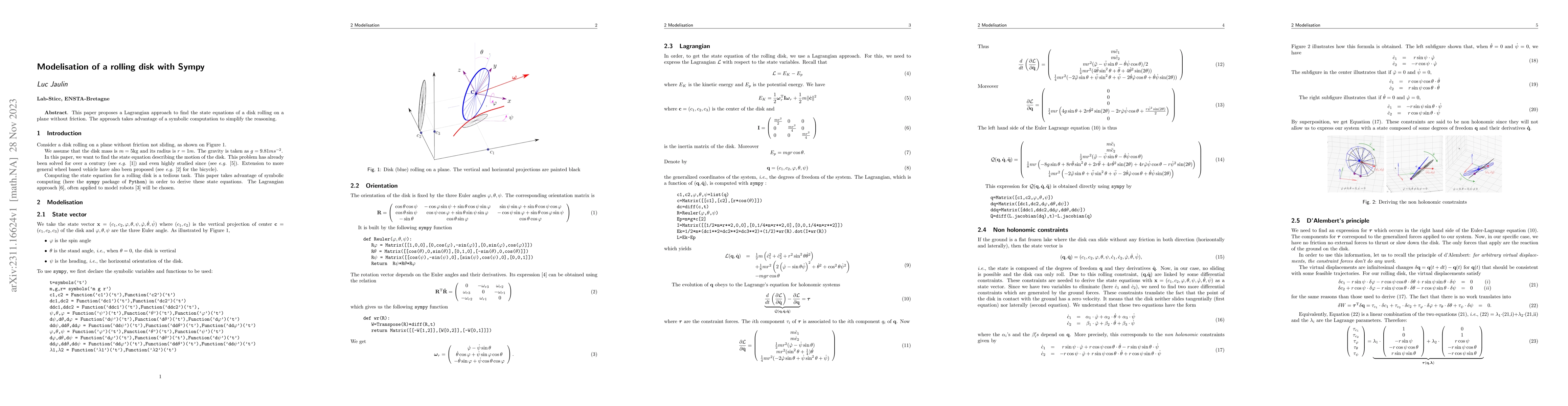 Summary: This paper utilizes a Lagrangian method and symbolic computation via Sympy to derive the state equations for a frictionless rolling disk, simplifying the complex dynamics involved.