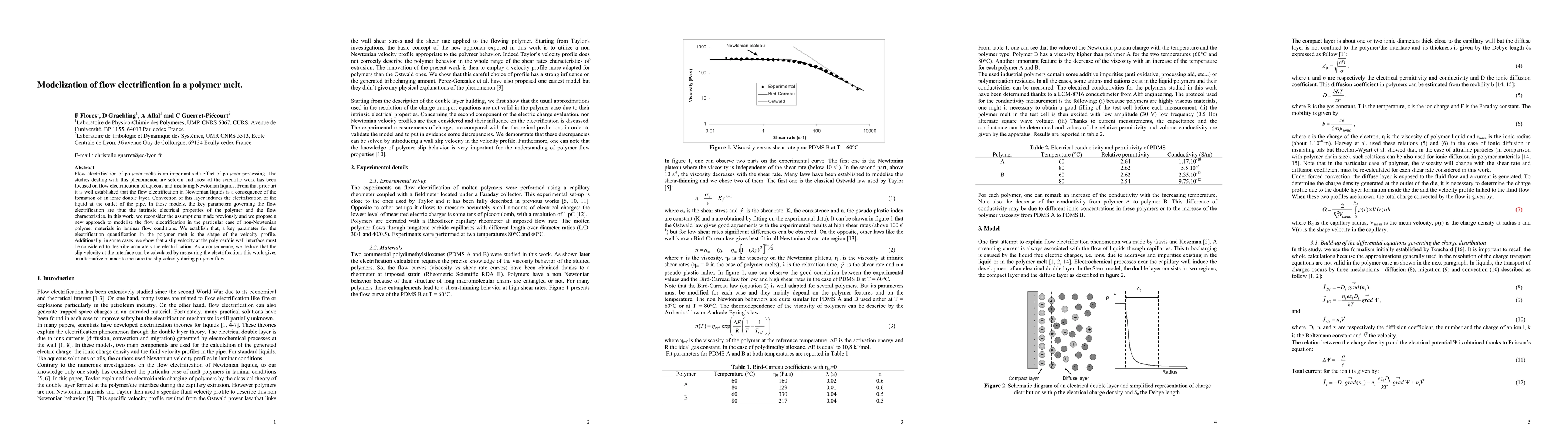 This paper proposes a new model for flow electrification in polymer melts, emphasizing the role of velocity profile shape and slip velocity at the polymer/die wall interface. It suggests that slip velocity can be inferred from the degree of electrification, offering a novel method to measure this parameter during polymer processing.