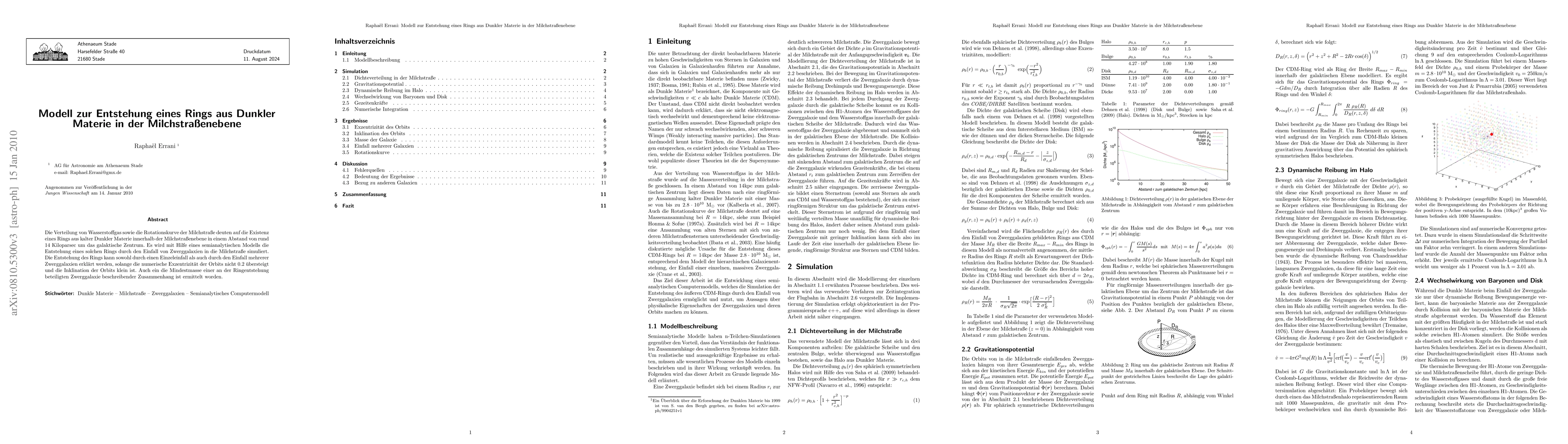 Both the distribution of hydrogen and the rotation curve of the Milky Way indicate the existence of a ring of Cold Dark Matter in the galactic plane with a radius of 14 kiloparsecs around the galactic centre. Using a semianalytical model, the formation of such a structure by the accretion of dwarf galaxies is simulated. The formation of the ring can be explained by the infall of a single dwarf galaxy, as well as by the infall of several dwarf galaxies under the condition that the eccentricity of the orbits is not larger than 0.2 and the inclination of the orbits is small. Also exclusion limits for the mass of dwarf galaxies, which contributed to the formation of the ring, are determined. ----- Die Verteilung von Wasserstoffgas sowie die Rotationskurve der Milchstra{\ss}e deuten auf die Existenz eines Rings aus kalter Dunkler Materie innerhalb der Milchstra{\ss}enebene in einem Abstand von rund 14 Kiloparsec um das galaktische Zentrum. Es wird mit Hilfe eines semianalytischen Modells die Entstehung eines solchen Rings durch den Einfall von Zwerggalaxien in die Milchstra{\ss}e simuliert. Die Entstehung des Rings kann sowohl durch einen Einzeleinfall als auch durch den Einfall mehrerer Zwerggalaxien erkl\"art werden, solange die numerische Exzentrizit\"at der Orbits nicht 0.2 \"ubersteigt und die Inklination der Orbits klein ist. Auch ein die Mindestmasse einer an der Ringentstehung beteiligten Zwerggalaxie beschreibender Zusammenhang ist ermittelt worden.