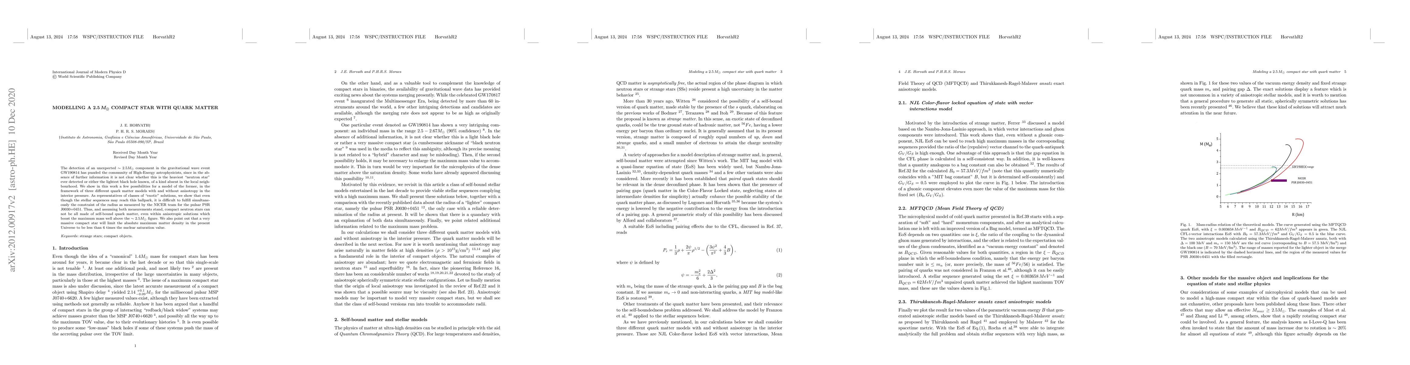 This paper explores the possibility of a $2.5 \, M_{\odot}$ compact star composed of quark matter, using three different models. It concludes that such a star cannot be entirely made of self-bound quark matter, even with anisotropic pressure, due to conflicting radius constraints.