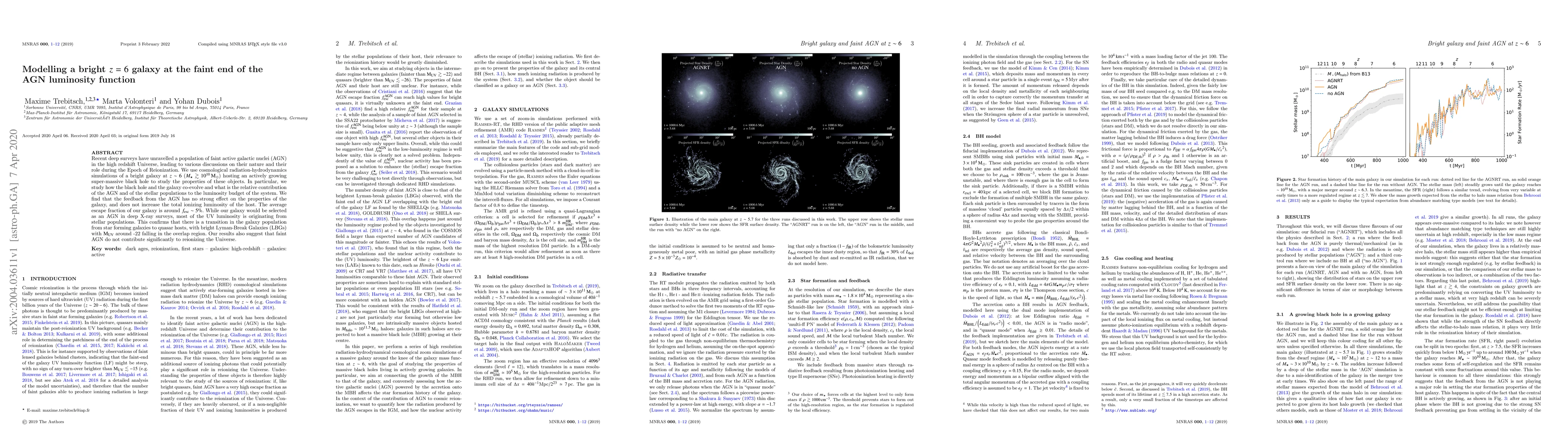 Recent deep surveys have unravelled a population of faint active galactic nuclei (AGN) in the high redshift Universe, leading to various discussions on their nature and their role during the Epoch of Reionization. We use cosmological radiation-hydrodynamics simulations of a bright galaxy at z = 6 ($M_\star \gtrsim 10^{10} M_\odot$) hosting an actively growing super-massive black hole to study the properties of these objects. In particular, we study how the black hole and the galaxy co-evolve and what is the relative contribution of the AGN and of the stellar populations to the luminosity budget of the system. We find that the feedback from the AGN has no strong effect on the properties of the galaxy, and does not increase the total ionizing luminosity of the host. The average escape fraction of our galaxy is around $f_{\rm esc} \sim 5\%$. While our galaxy would be selected as an AGN in deep X-ray surveys, most of the UV luminosity is originating from stellar populations. This confirms that there is a transition in the galaxy population from star forming galaxies to quasar hosts, with bright Lyman-Break Galaxies (LBGs) with $M_{\rm UV}$ around -22 falling in the overlap region. Our results also suggest that faint AGN do not contribute significantly to reionizing the Universe.