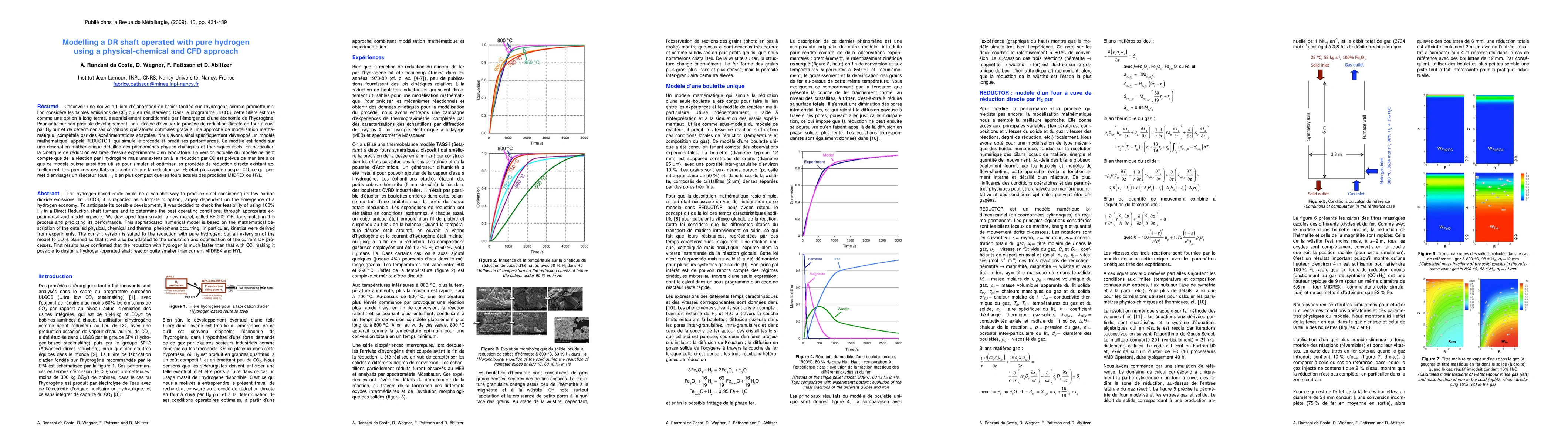 The hydrogen-based route could be a valuable way to produce steel considering its low carbon dioxide emissions. In ULCOS, it is regarded as a long-term option, largely dependent on the emergence of a hydrogen economy. To anticipate its possible development, it was decided to check the feasibility of using 100% H2 in a Direct Reduction shaft furnace and to determine the best operating conditions, through appropriate experimental and modelling work. We developed from scratch a new model, called REDUCTOR, for simulating this process and predicting its performance. This sophisticated numerical model is based on the mathematical description of the detailed physical, chemical and thermal phenomena occurring. In particular, kinetics were derived from experi-ments. The current version is suited to the reduction with pure hydrogen, but an extension of the model to CO is planned so that it will also be adapted to the simulation and optimisation of the current DR processes. First re-sults have confirmed that the reduction with hydrogen is much faster than that with CO, making it possible to design a hydrogen-operated shaft reactor quite smaller than current MIDREX and HYL.