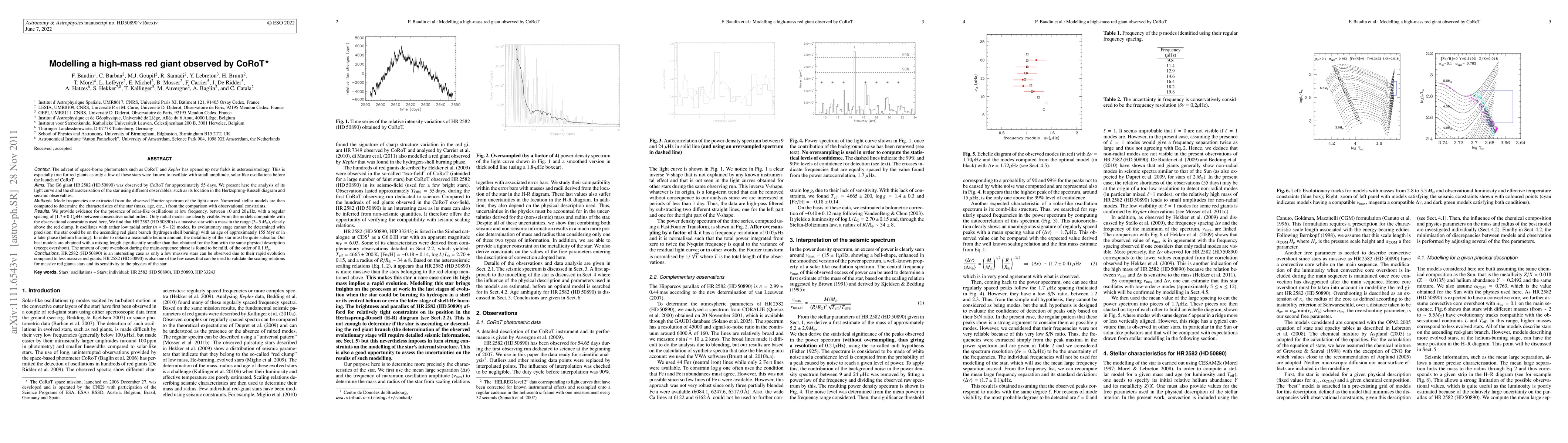 The G6 giant HR\,2582 (HD\,50890) was observed by CoRoT for approximately 55 days. Mode frequencies are extracted from the observed Fourier spectrum of the light curve. Numerical stellar models are then computed to determine the characteristics of the star (mass, age, etc...) from the comparison with observational constraints. We provide evidence for the presence of solar-like oscillations at low frequency, between 10 and 20\,$\mu$Hz, with a regular spacing of $(1.7\pm0.1)\mu$Hz between consecutive radial orders. Only radial modes are clearly visible. From the models compatible with the observational constraints used here, We find that HR\,2582 (HD\,50890) is a massive star with a mass in the range (3--\,5\,$M_{\odot}$), clearly above the red clump. It oscillates with rather low radial order ($n$ = 5\,--\,12) modes. Its evolutionary stage cannot be determined with precision: the star could be on the ascending red giant branch (hydrogen shell burning) with an age of approximately 155 Myr or in a later phase (helium burning). In order to obtain a reasonable helium amount, the metallicity of the star must be quite subsolar. Our best models are obtained with a mixing length significantly smaller than that obtained for the Sun with the same physical description (except overshoot). The amount of core overshoot during the main-sequence phase is found to be mild, of the order of 0.1\,$H_{\rm p}$.