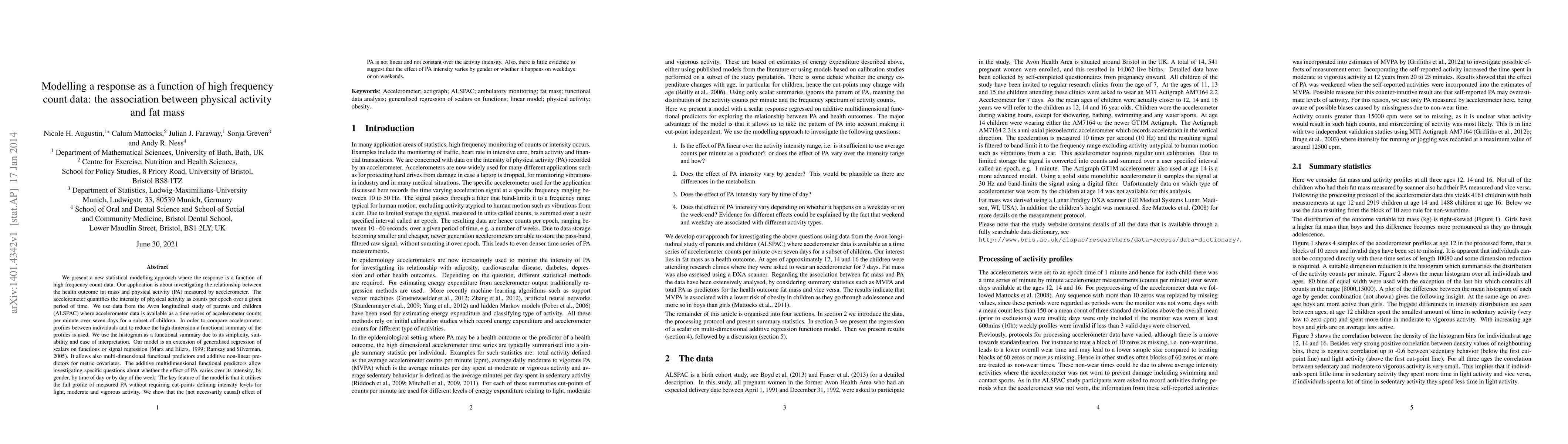 We present a new statistical modelling approach where the response is a function of high frequency count data. Our application is about investigating the relationship between the health outcome fat mass and physical activity (PA) measured by accelerometer. The accelerometer quantifies the intensity of physical activity as counts per epoch over a given period of time. We use data from the Avon longitudinal study of parents and children (ALSPAC) where accelerometer data is available as a time series of accelerometer counts per minute over seven days for a subset of children. In order to compare accelerometer profiles between individuals and to reduce the high dimension a functional summary of the profiles is used. We use the histogram as a functional summary due to its simplicity, suitability and ease of interpretation. Our model is an extension of generalised regression of scalars on functions or signal regression. It allows also multi-dimensional functional predictors and additive non-linear predictors for metric covariates. The additive multidimensional functional predictors allow investigating specific questions about whether the effect of PA varies over its intensity, by gender, by time of day or by day of the week. The key feature of the model is that it utilises the full profile of measured PA without requiring cut-points defining intensity levels for light, moderate and vigorous activity. We show that the (not necessarily causal) effect of PA is not linear and not constant over the activity intensity. Also, there is little evidence to suggest that the effect of PA intensity varies by gender or whether it happens on weekdays or on weekends.