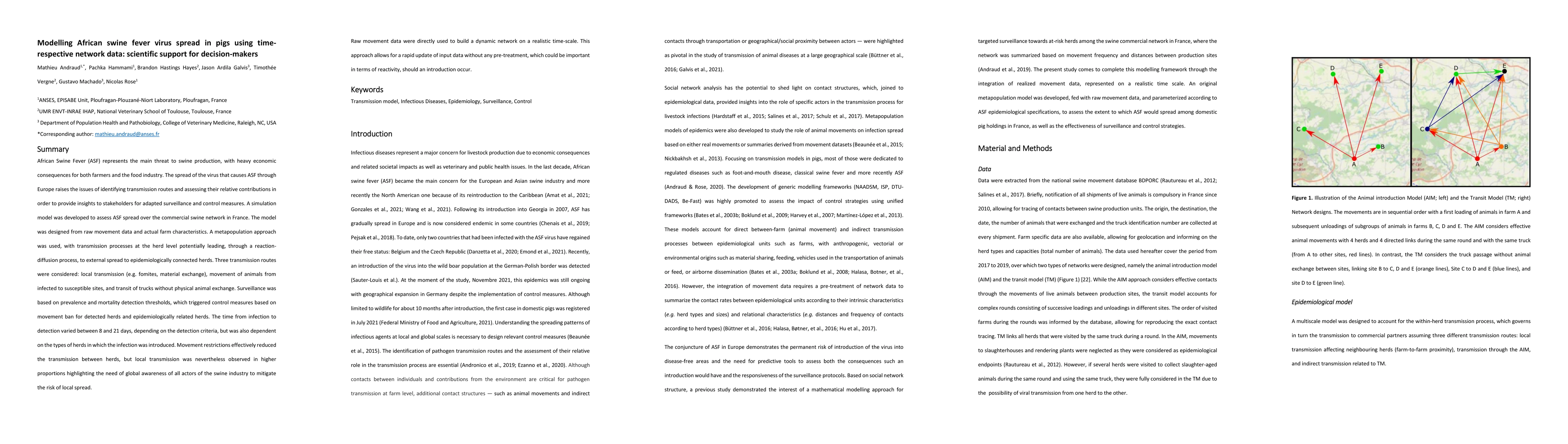 African Swine Fever (ASF) represents the main threat to swine production, with heavy economic consequences for both farmers and the food industry. The spread of the virus that causes ASF through Europe raises the issues of identifying transmission routes and assessing their relative contributions in order to provide insights to stakeholders for adapted surveillance and control measures. A simulation model was developed to assess ASF spread over the commercial swine network in France. The model was designed from raw movement data and actual farm characteristics. A metapopulation approach was used, with transmission processes at the herd level potentially leading, through a reaction-diffusion process, to external spread to epidemiologically connected herds. Three transmission routes were considered: local transmission (e.g. fomites, material exchange), movement of animals from infected to susceptible sites, and transit of trucks without physical animal exchange. Surveillance was based on prevalence and mortality detection thresholds, which triggered control measures based on movement ban for detected herds and epidemiologically related herds. The time from infection to detection varied between 8 and 21 days, depending on the detection criteria, but was also dependent on the types of herds in which the infection was introduced. Movement restrictions effectively reduced the transmission between herds, but local transmission was nevertheless observed in higher proportions highlighting the need of global awareness of all actors of the swine industry to mitigate the risk of local spread. Raw movement data were directly used to build a dynamic network on a realistic time-scale. This approach allows for a rapid update of input data without any pre-treatment, which could be important in terms of reactivity, should an introduction occur.