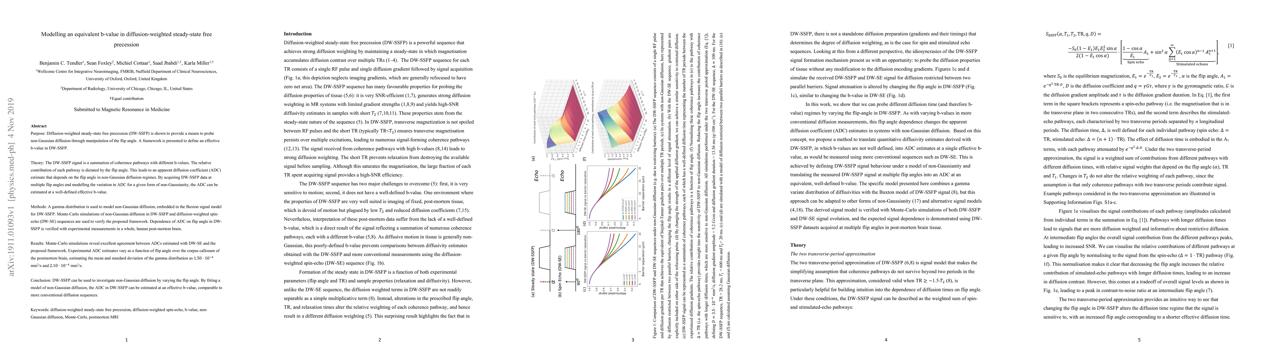 Purpose: Diffusion-weighted steady-state free precession (DW-SSFP) is shown to provide a means to probe non-Gaussian diffusion through manipulation of the flip angle. A framework is presented to define an effective b-value in DW-SSFP. Theory: The DW-SSFP signal is a summation of coherence pathways with different b-values. The relative contribution of each pathway is dictated by the flip angle. This leads to an apparent diffusion coefficient (ADC) estimate that depends on the flip angle in non-Gaussian diffusion regimes. By acquiring DW-SSFP data at multiple flip angles and modelling the variation in ADC for a given form of non-Gaussianity, the ADC can be estimated at a well-defined effective b-value. Methods: A gamma distribution is used to model non-Gaussian diffusion, embedded in the Buxton signal model for DW-SSFP. Monte-Carlo simulations of non-Gaussian diffusion in DW-SSFP and diffusion-weighted spin-echo (DW-SE) sequences are used to verify the proposed framework. Dependence of ADC on flip angle in DW-SSFP is verified with experimental measurements in a whole, human post-mortem brain. Results: Monte-Carlo simulations reveal excellent agreement between ADCs estimated with DW-SE and the proposed framework. Experimental ADC estimates vary as a function of flip angle over the corpus callosum of the postmortem brain, estimating the mean and standard deviation of the gamma distribution as $1.50\cdot 10^{-4} mm^2/s$ and $2.10\cdot 10^{-4} mm^2/s$. Conclusion: DW-SSFP can be used to investigate non-Gaussian diffusion by varying the flip angle. By fitting a model of non-Gaussian diffusion, the ADC in DW-SSFP can be estimated at an effective b-value, comparable to more conventional diffusion sequences.