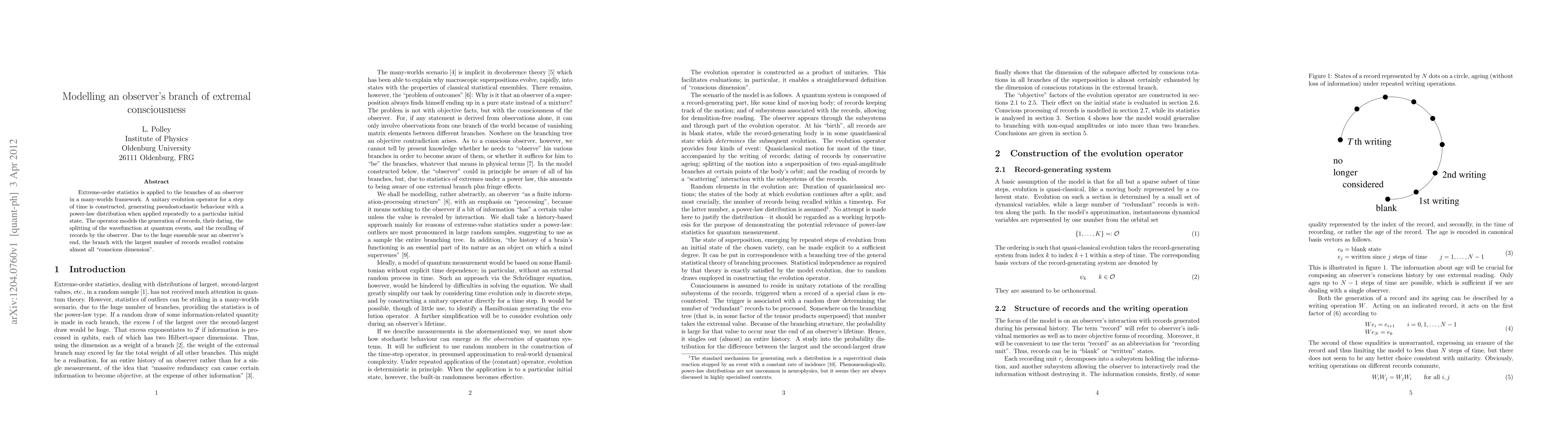 Extreme-order statistics is applied to the branches of an observer in a many-worlds framework. A unitary evolution operator for a step of time is constructed, generating pseudostochastic behaviour with a power-law distribution when applied repeatedly to a particular initial state. The operator models the generation of records, their dating, the splitting of the wavefunction at quantum events, and the recalling of records by the observer. Due to the huge ensemble near an observer's end, the branch with the largest number of records recalled contains almost all "conscious dimension".