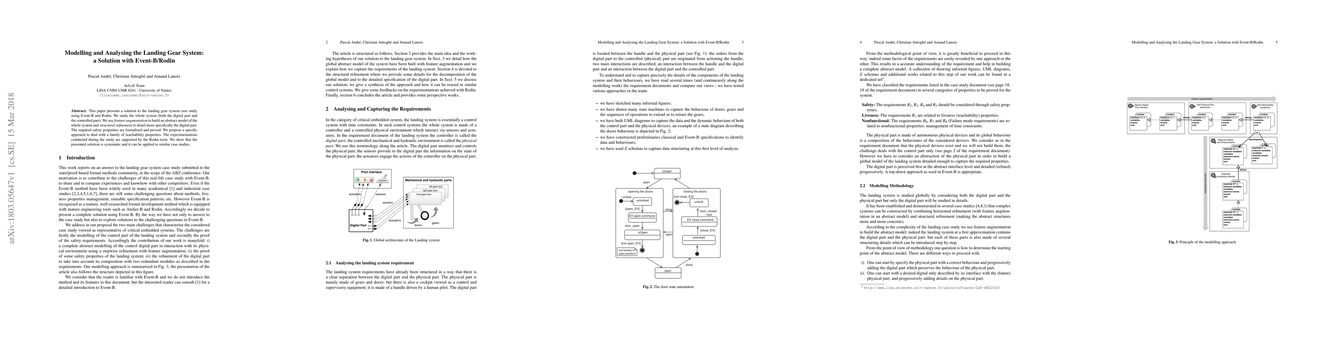 The paper presents a method for modelling and analysing the landing gear system using Event-B and Rodin, including feature augmentation and structural refinement.