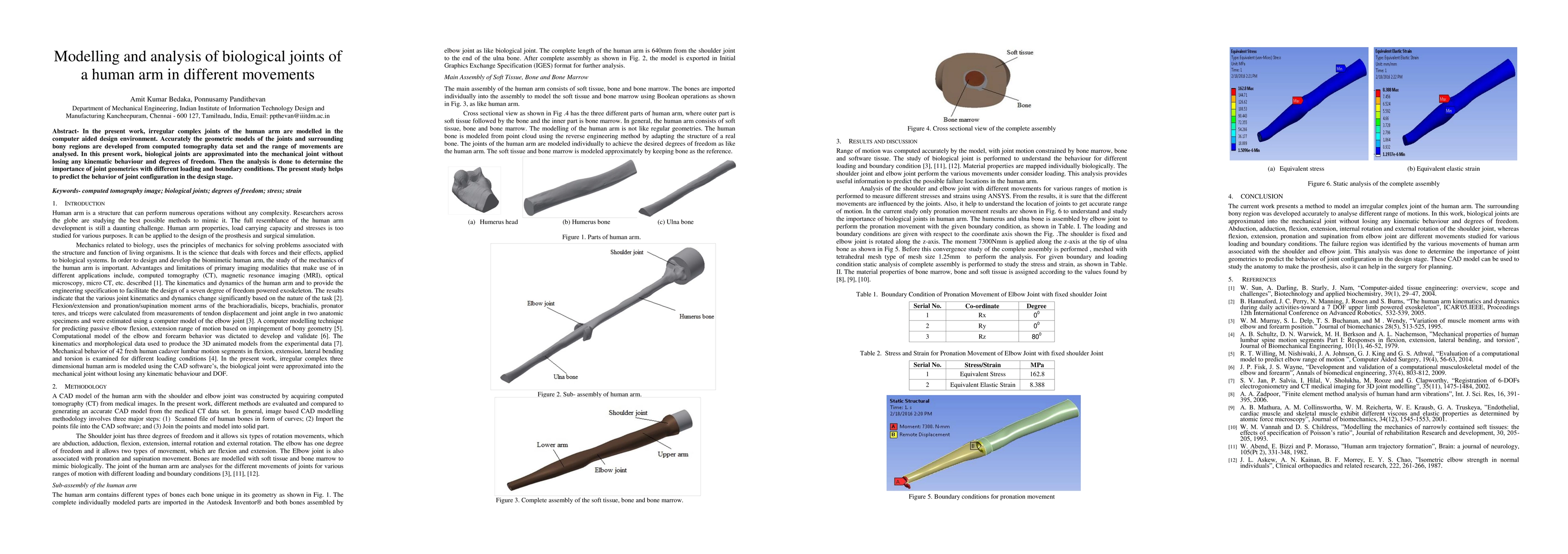 In the present work, irregular complex joints of the human arm are modelled in the computer-aided design environment. Accurately the geometric models of the joints and surrounding bony regions are developed from computed tomography data set and the range of movements are analysed. In this present work, biological joints are approximated into the mechanical joint without losing any kinematic behaviour and degrees of freedom. Then the analysis is done to determine the importance of joint geometries with different loading and boundary conditions. The present study helps to predict the behavior of joint configuration in the design stage.