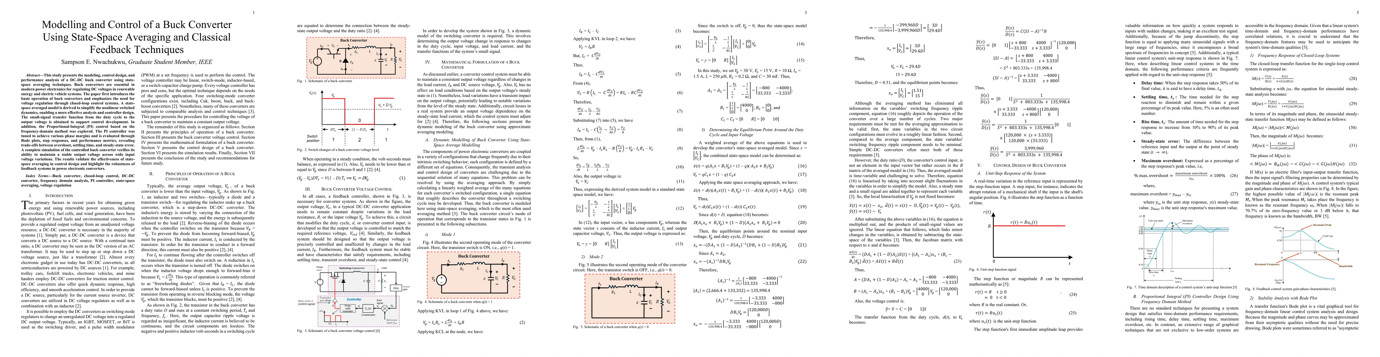 This study presents the modeling, control design, and performance analysis of a DC-DC buck converter using state-space averaging techniques. Buck converters are essential in modern power electronics for regulating DC voltages in renewable energy and electric vehicle systems. The paper first introduces the basic operation of buck converters and emphasizes the need for voltage regulation through closed-loop control systems. A state-space averaged model is derived to simplify the nonlinear switched dynamics, enabling a more effective analysis and controller design. The small-signal transfer function from the duty cycle to the output voltage is obtained to support control development. In addition, the Proportional-Integral (PI) control based on the frequency-domain method was explored. The PI controller was tuned to achieve various phase margins and is evaluated through Bode plots, step responses, and performance metrics, revealing trade-offs between overshoot, settling time, and steady-state error. A complete simulation of the controlled buck converter verifies its ability to maintain a stable output voltage across wide input voltage variations. The results validate the effectiveness of state-space averaging in control design and highlight the robustness of feedback systems in power electronic converters.