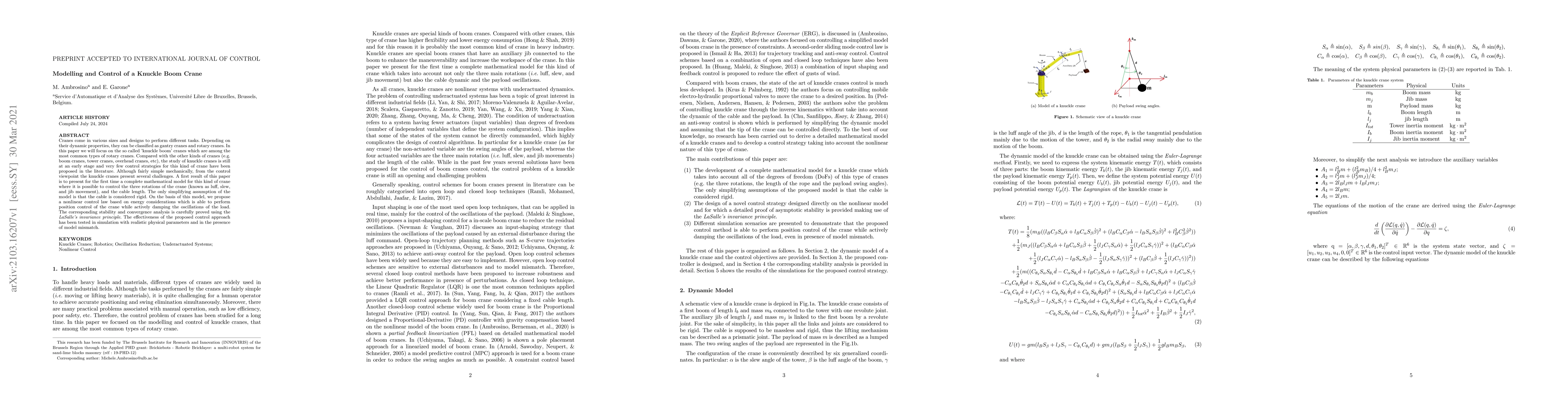 This paper presents a mathematical model for knuckle boom cranes, focusing on controlling three rotations and cable length. It proposes a nonlinear control strategy based on energy considerations for position control and active damping, validated through stability and convergence analysis, and tested in simulations.