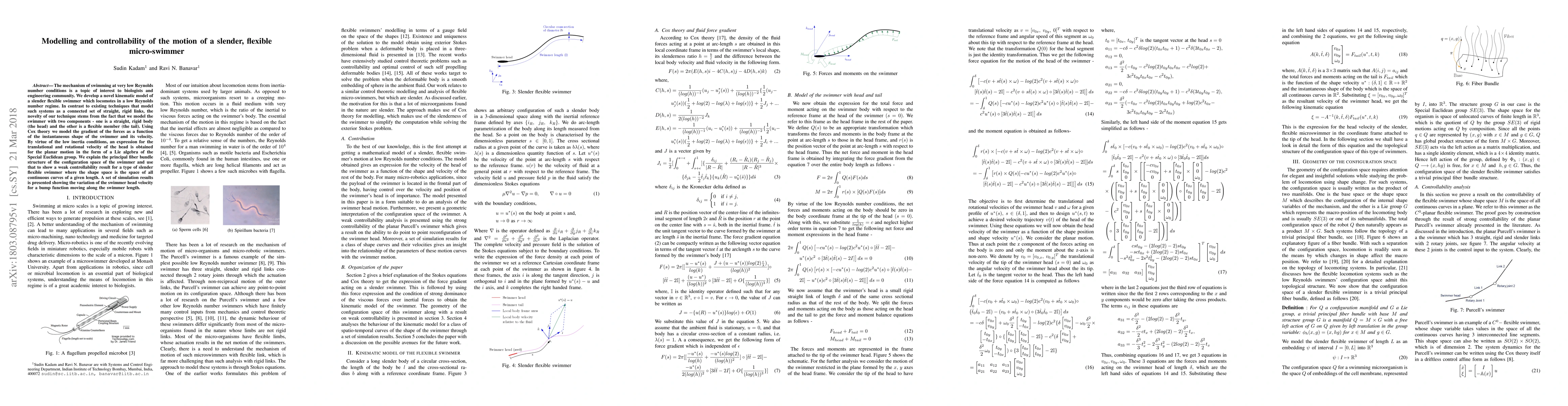 Researchers developed a novel model of a slender flexible swimmer's motion at low Reynolds number conditions, revealing a weak controllability result for a specific type of swimmer with shape-controlled movement.