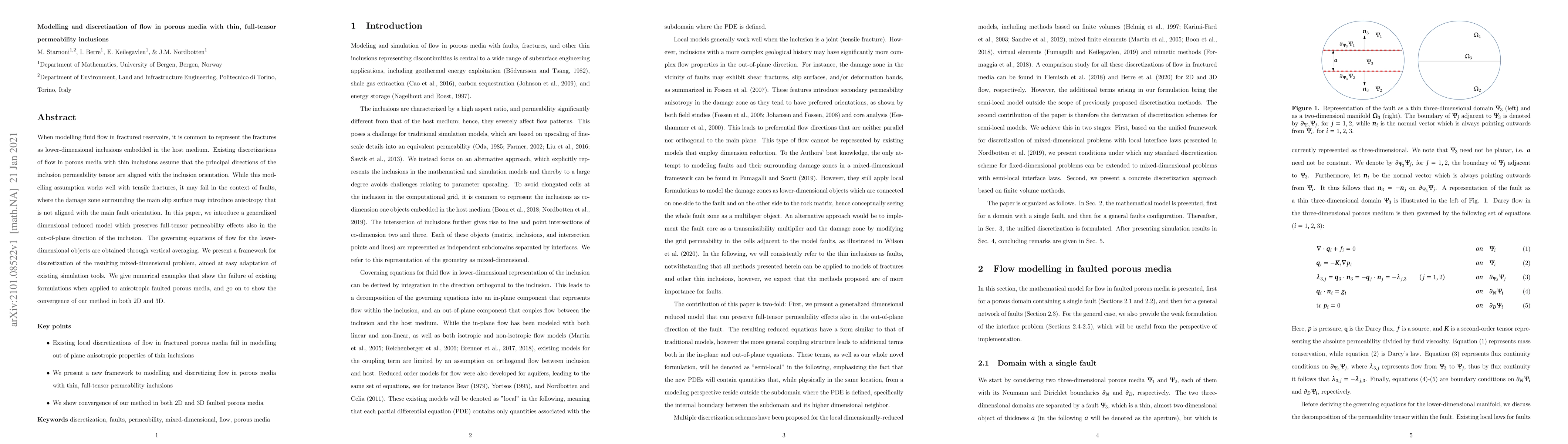 When modelling fluid flow in fractured reservoirs, it is common to represent the fracturesas lower-dimensional inclusions embedded in the host medium. Existing discretizationsof flow in porous media with thin inclusions assume that the principal directions of theinclusion permeability tensor are aligned with the inclusion orientation. While this mod-elling assumption works well with tensile fractures, it may fail in the context of faults,where the damage zone surrounding the main slip surface may introduce anisotropy thatis not aligned with the main fault orientation. In this paper, we introduce a generalizeddimensional reduced model which preserves full-tensor permeability effects also in theout-of-plane direction of the inclusion. The governing equations of flow for the lower-dimensional objects are obtained through vertical averaging. We present a framework fordiscretization of the resulting mixed-dimensional problem, aimed at easy adaptation ofexisting simulation tools. We give numerical examples that show the failure of existingformulations when applied to anisotropic faulted porous media, and go on to show theconvergence of our method in both 2D and 3D