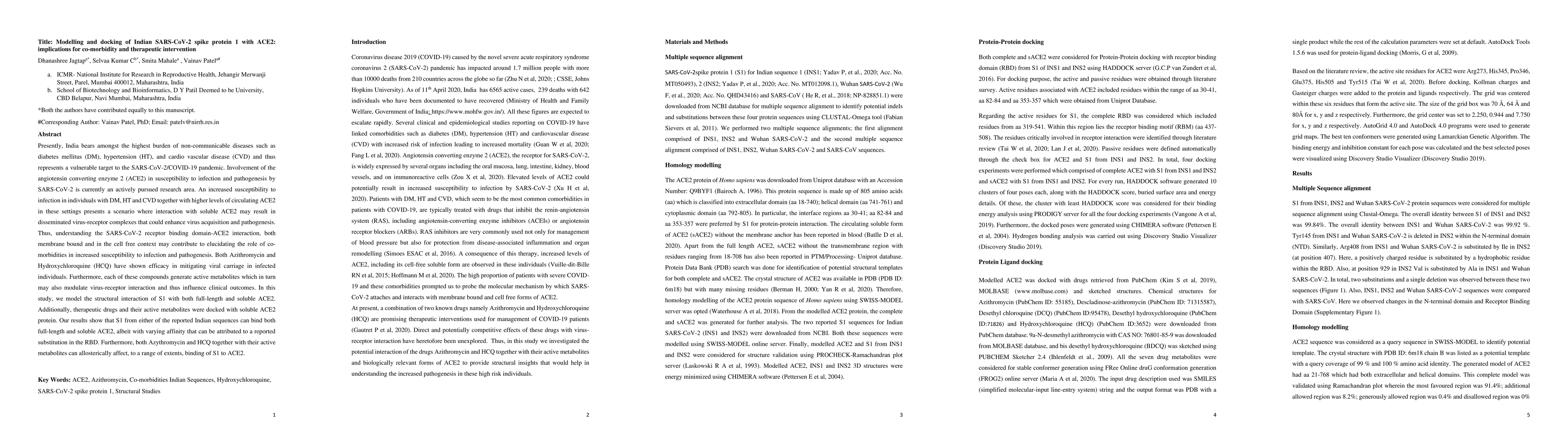 Presently, India bears amongst the highest burden of non-communicable diseases such as diabetes mellitus (DM), hypertension (HT), and cardio vascular disease (CVD) and thus represents a vulnerable target to the SARS-CoV-2/COVID-19 pandemic. Involvement of the angiotensin converting enzyme 2 (ACE2) in susceptibility to infection and pathogenesis by SARS-CoV-2 is currently an actively pursued research area. An increased susceptibility to infection in individuals with DM, HT and CVD together with higher levels of circulating ACE2 in these settings presents a scenario where interaction with soluble ACE2 may result in disseminated virus-receptor complexes that could enhance virus acquisition and pathogenesis. Thus, understanding the SARS-CoV-2 receptor binding domain-ACE2 interaction, both membrane bound and in the cell free context may contribute to elucidating the role of co-morbidities in increased susceptibility to infection and pathogenesis. Both Azithromycin and Hydroxychloroquine (HCQ) have shown efficacy in mitigating viral carriage in infected individuals. Furthermore, each of these compounds generate active metabolites which in turn may also modulate virus-receptor interaction and thus influence clinical outcomes. In this study, we model the structural interaction of S1 with both full-length and soluble ACE2. Additionally, therapeutic drugs and their active metabolites were docked with soluble ACE2 protein. Our results show that S1 from either of the reported Indian sequences can bind both full-length and soluble ACE2, albeit with varying affinity that can be attributed to a reported substitution in the RBD. Furthermore, both Azythromycin and HCQ together with their active metabolites can allosterically affect, to a range of extents, binding of S1 to ACE2.