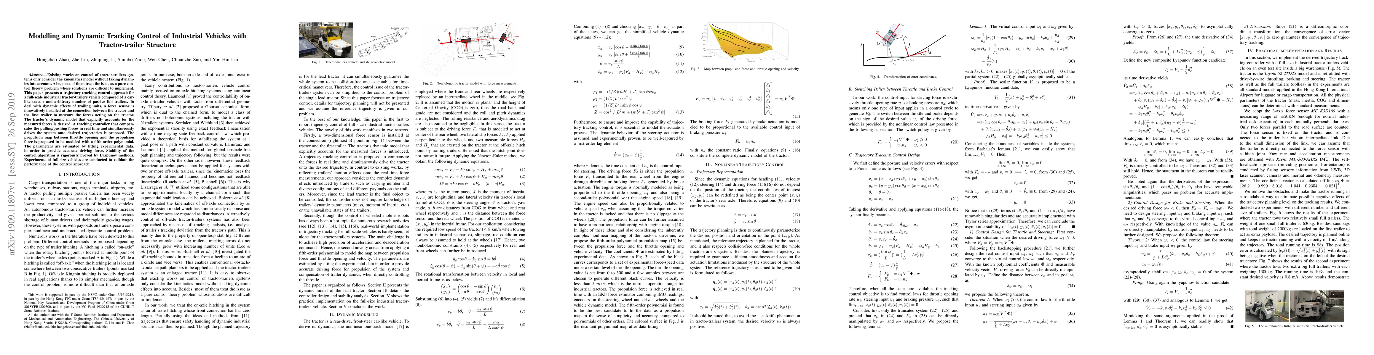 This paper proposes a dynamic tracking control approach for industrial tractor-trailers, incorporating both kinematics and dynamics models. It introduces a force sensor to measure interactions between the tractor and the first trailer, and a fifth-order polynomial model for propulsion force, validated through experimental testing.