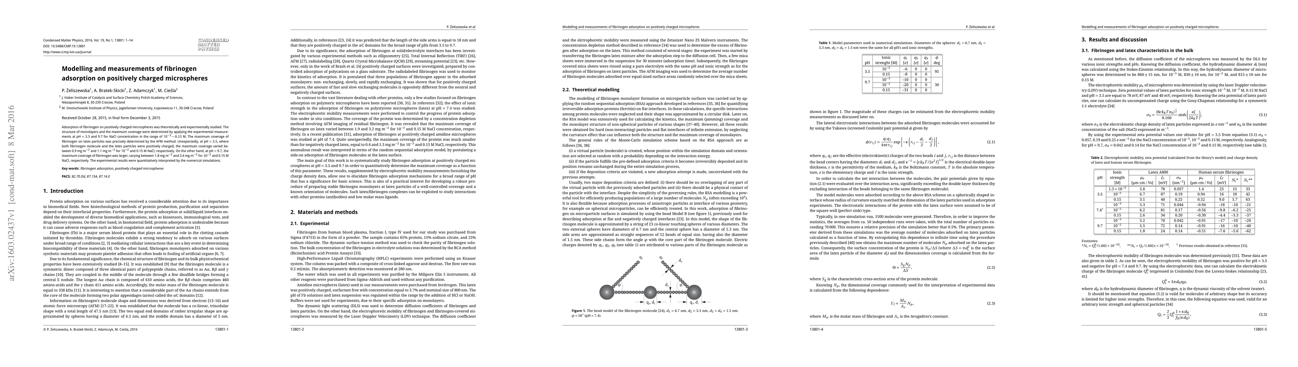 This study investigates both theoretically and experimentally the adsorption of fibrinogen on positively charged microspheres, finding that maximum coverage varies significantly with pH and NaCl concentration, and uses AFM to precisely determine these values. Numerical simulations provide a quantitative interpretation of the experimental results.
