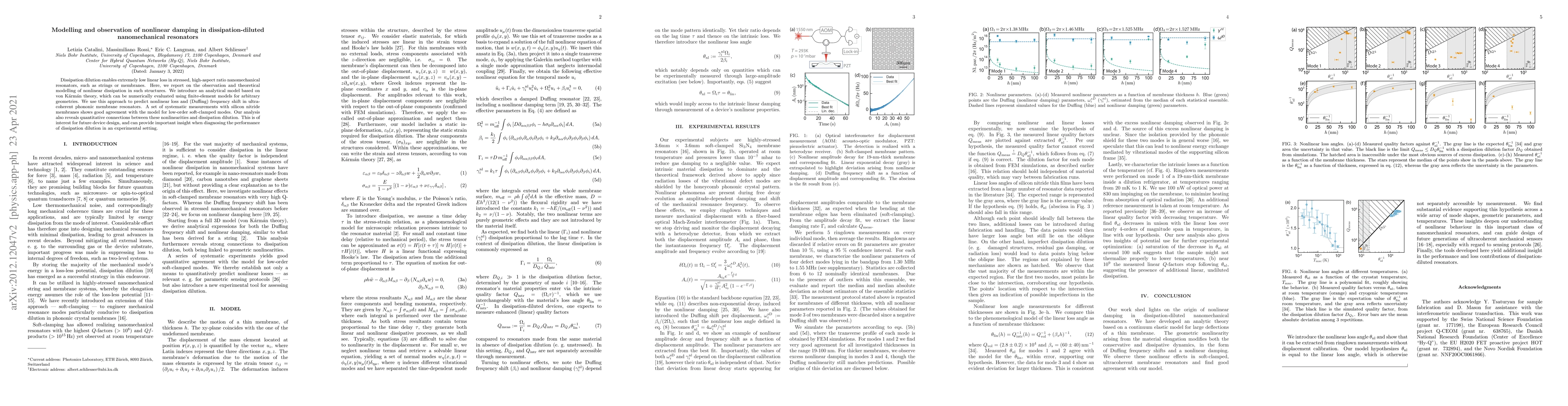 This paper presents a theoretical model for nonlinear damping in dissipation-diluted nanomechanical resonators, validated through experimental measurements on silicon nitride membranes. The model, based on von Kármán theory, accurately predicts nonlinear loss and frequency shifts, offering insights for future device design and performance analysis.