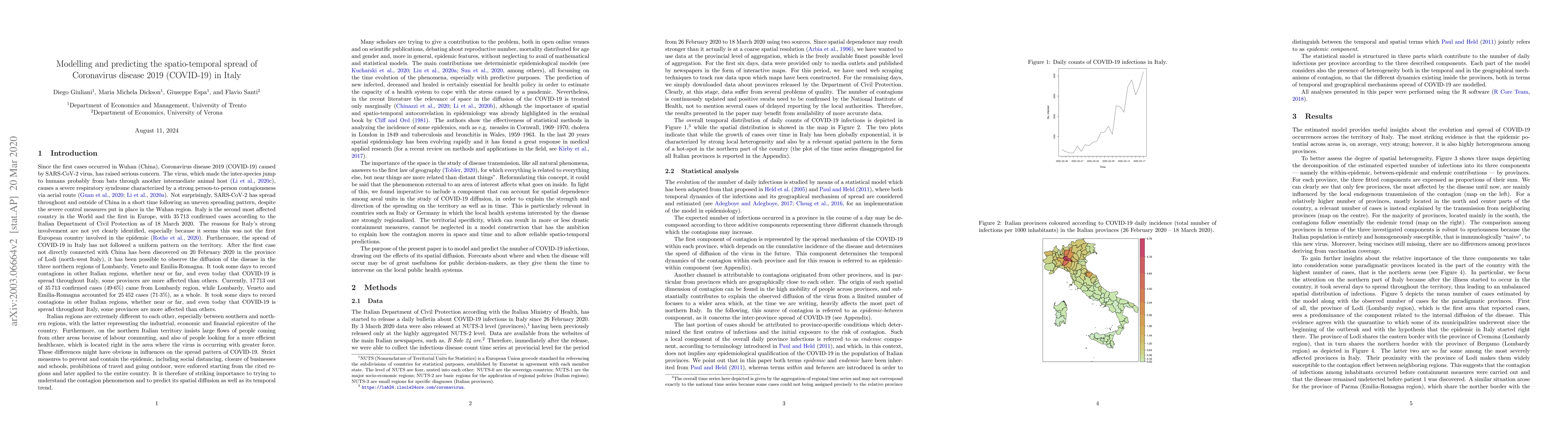 A model predicts the spread of COVID-19 in Italy, with accurate forecasts for the country but distinct patterns at local levels, reflecting the impact of spatial neighbours on affected provinces.