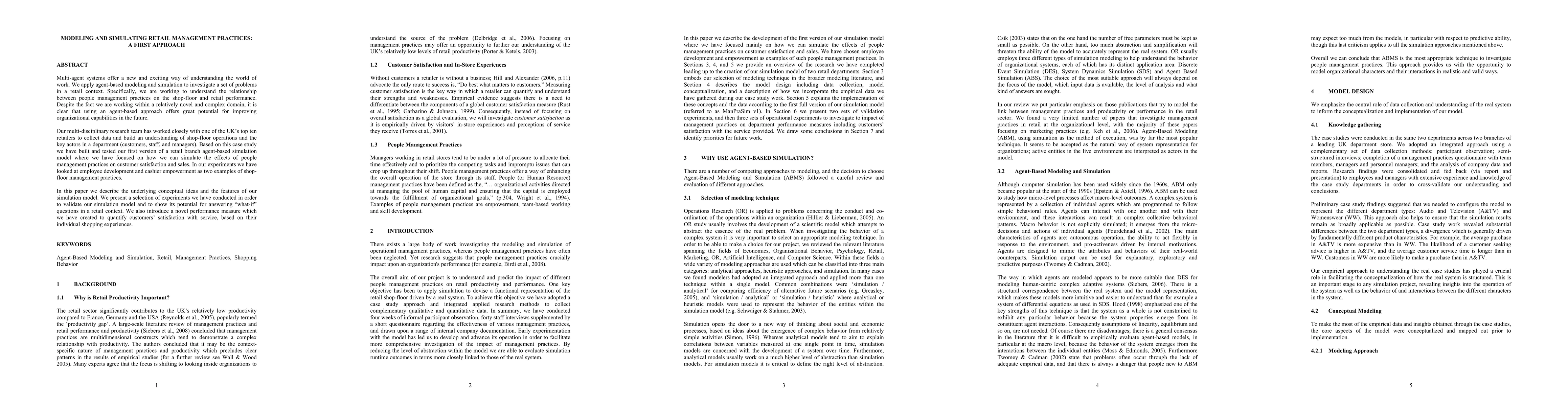 This paper explores the application of agent-based modeling to simulate retail management practices, focusing on the impact of people management on performance. The authors develop a simulation model to test the effects of employee development and cashier empowerment on customer satisfaction and sales, introducing a new performance measure to quantify customer satisfaction.