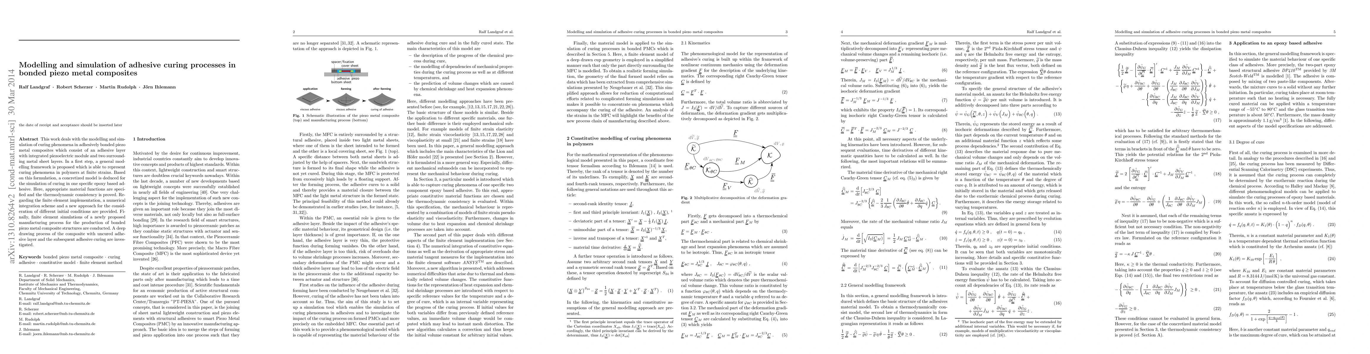 This paper proposes a modelling framework for simulating adhesive curing in piezo metal composites, focusing on an epoxy-based adhesive. It includes a finite element implementation and investigates a new manufacturing process involving deep drawing and curing.