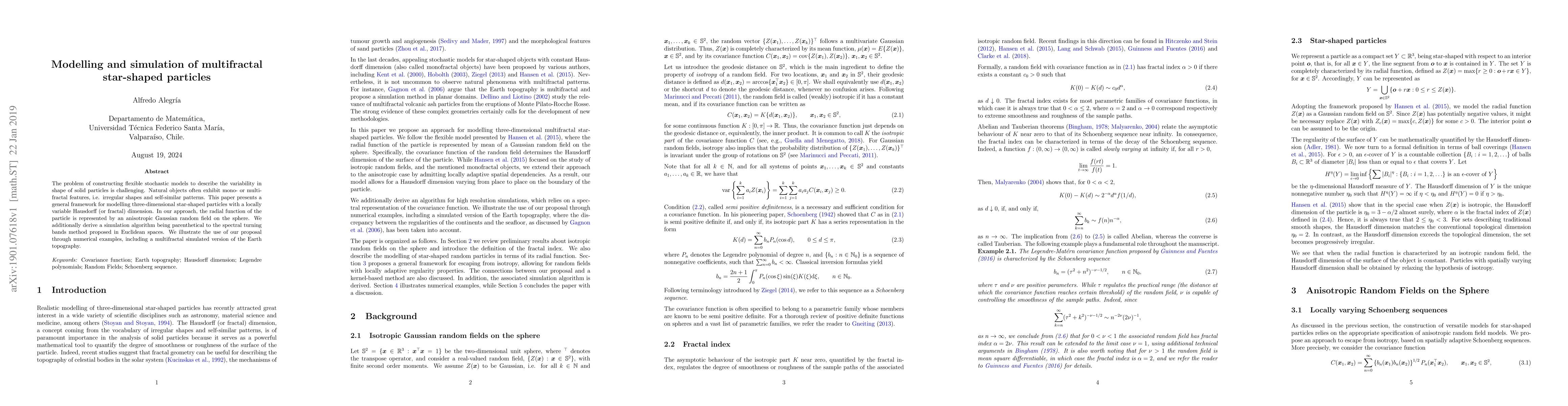Researchers develop a framework to model star-shaped particles with variable shapes, using an anisotropic Gaussian random field on the sphere. This approach allows for flexible modeling of multifractal features, such as those found in natural objects like the Earth's topography.